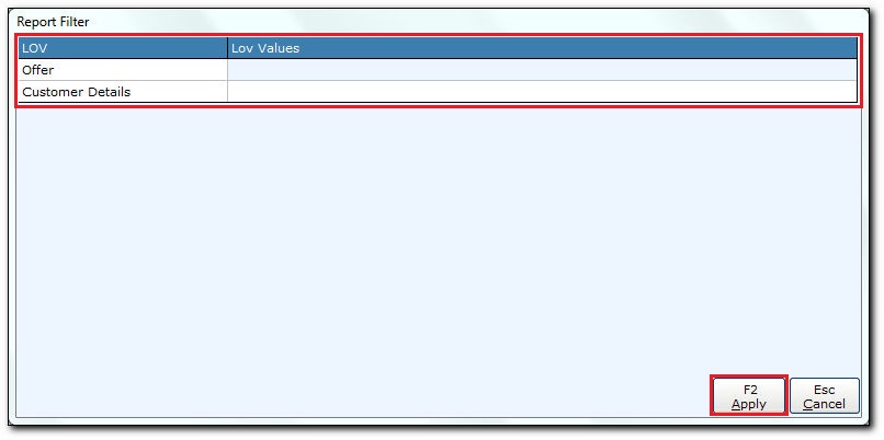 - In the Offer field, press ENTER. A list of Offer screen is displayed, select the offer by pressing SPACE BAR.