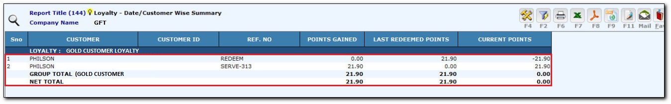 - Click Apply or press F2 key to see the Loyalty - Date/Customer Wise Summary.