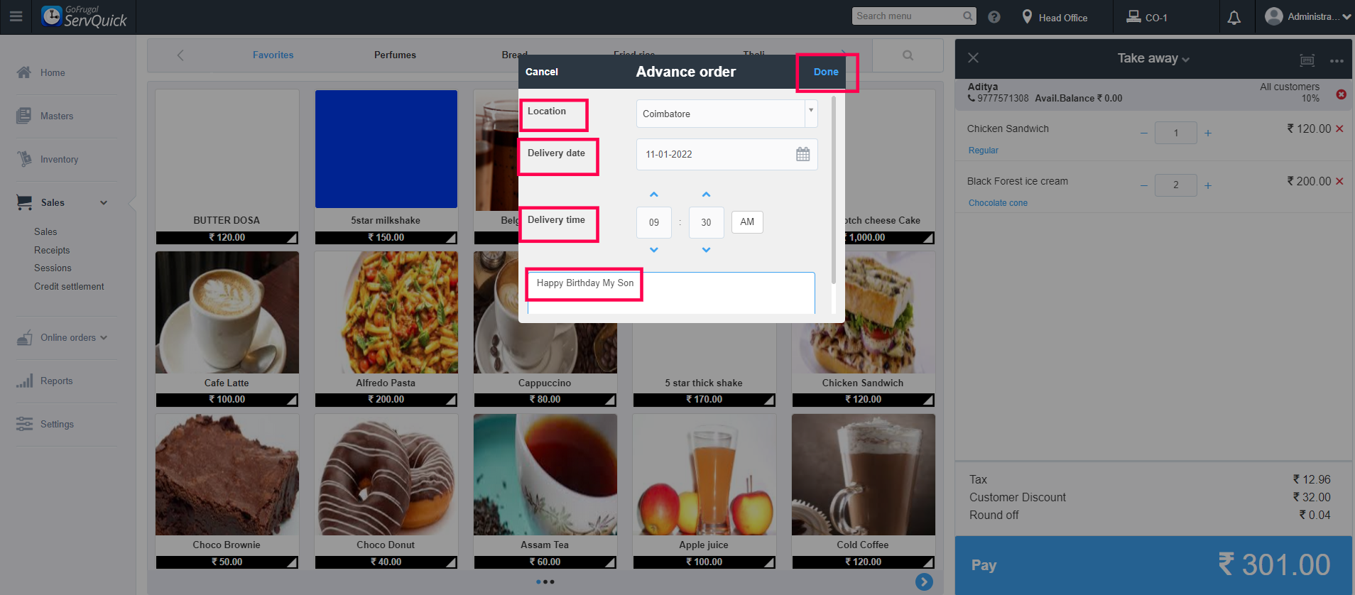 Note: You can also enter remarks to this advance order. For instance; If the customer is ordering a cake for this son's birthday, then you can enter what should be written on the cake in the Remarks field.