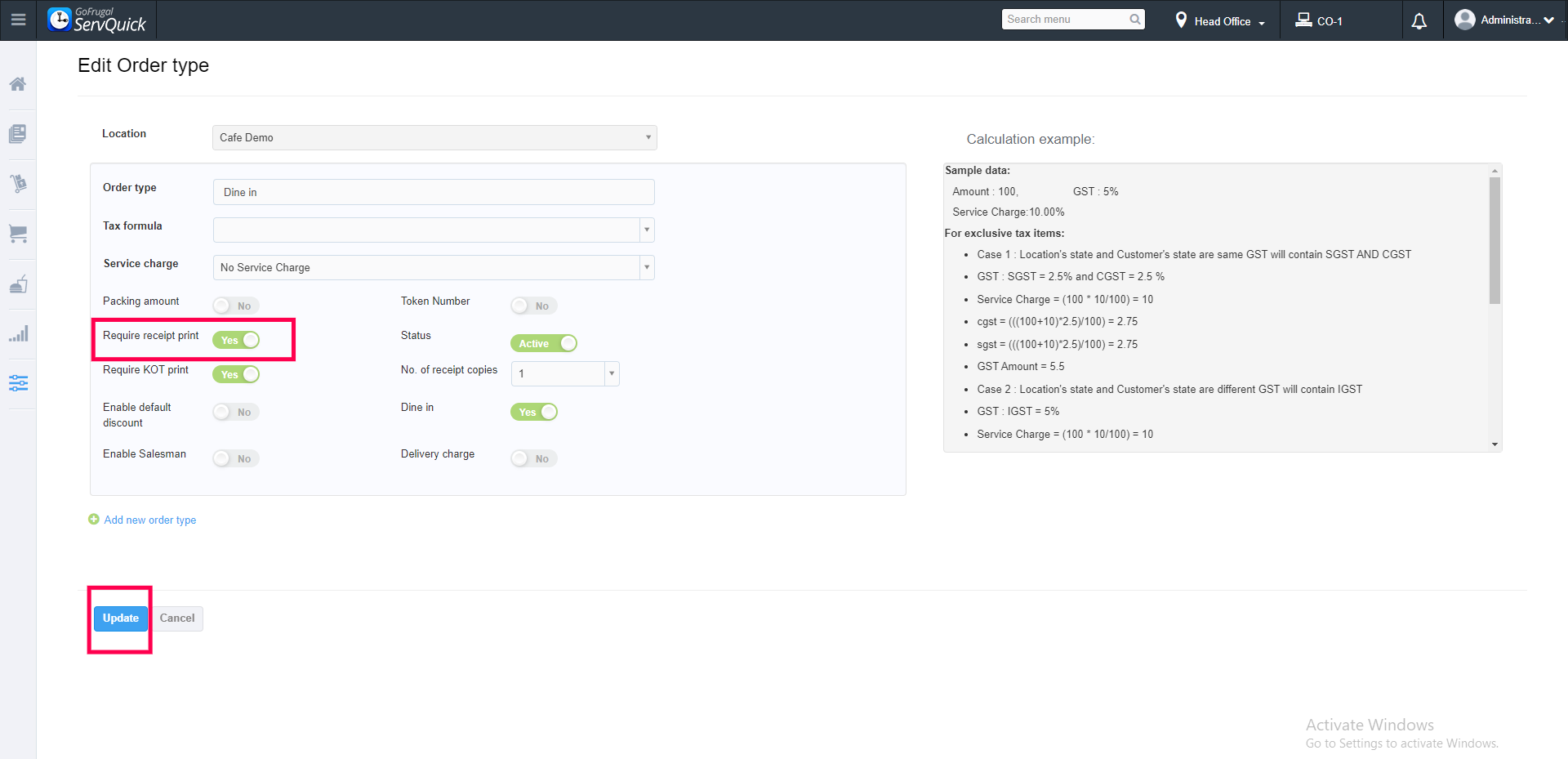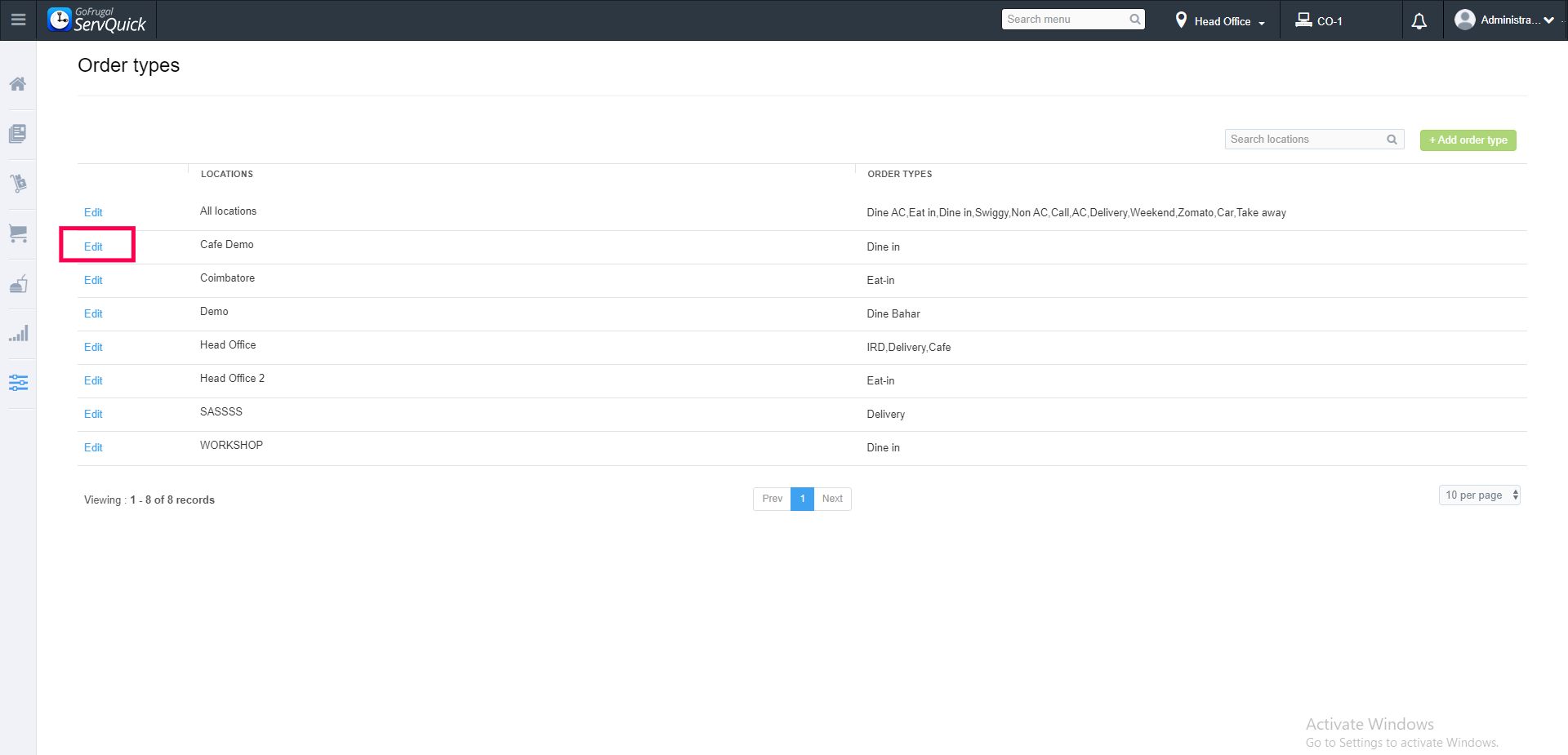 Step4: Choose the Order Type for which you ant to print the receipt and click on Edit