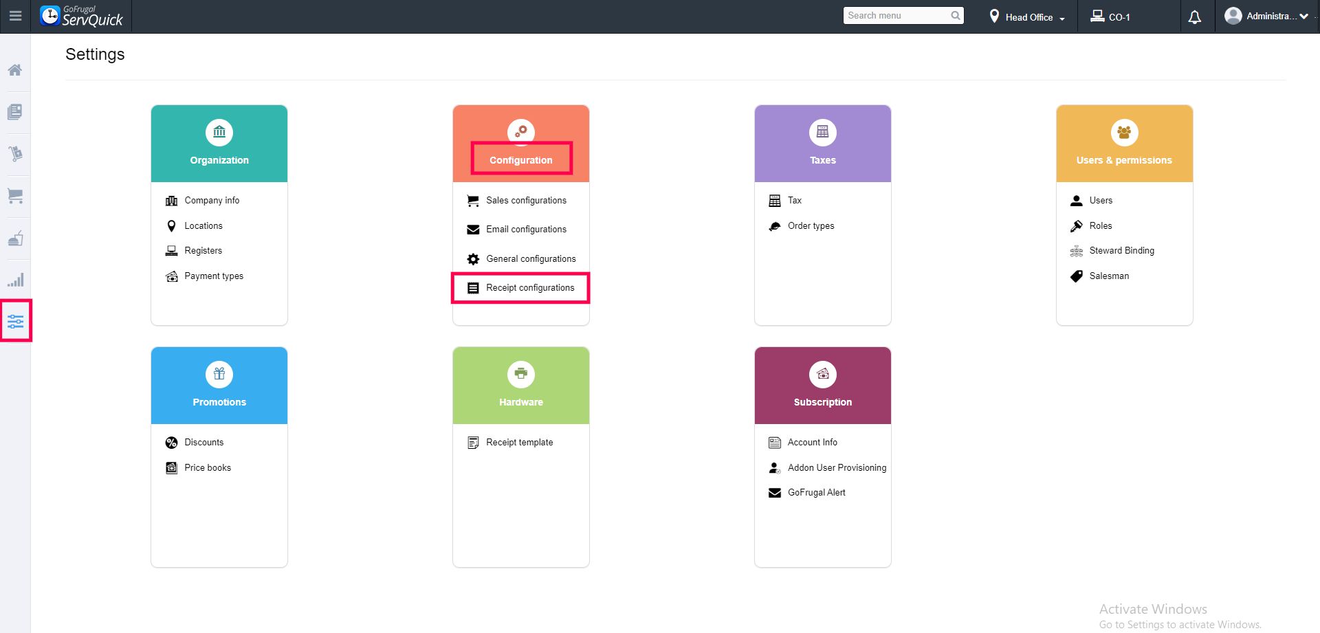 Step1: Go to Settings, under Configurations select Receipt Configuration