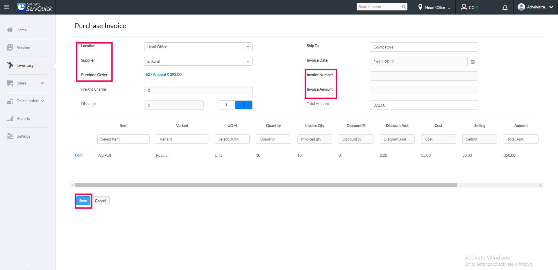 Step3: Enter the mandatory fields like Franchise Location, Supplier name, Purchase order number, Invoice number, Invoice amount