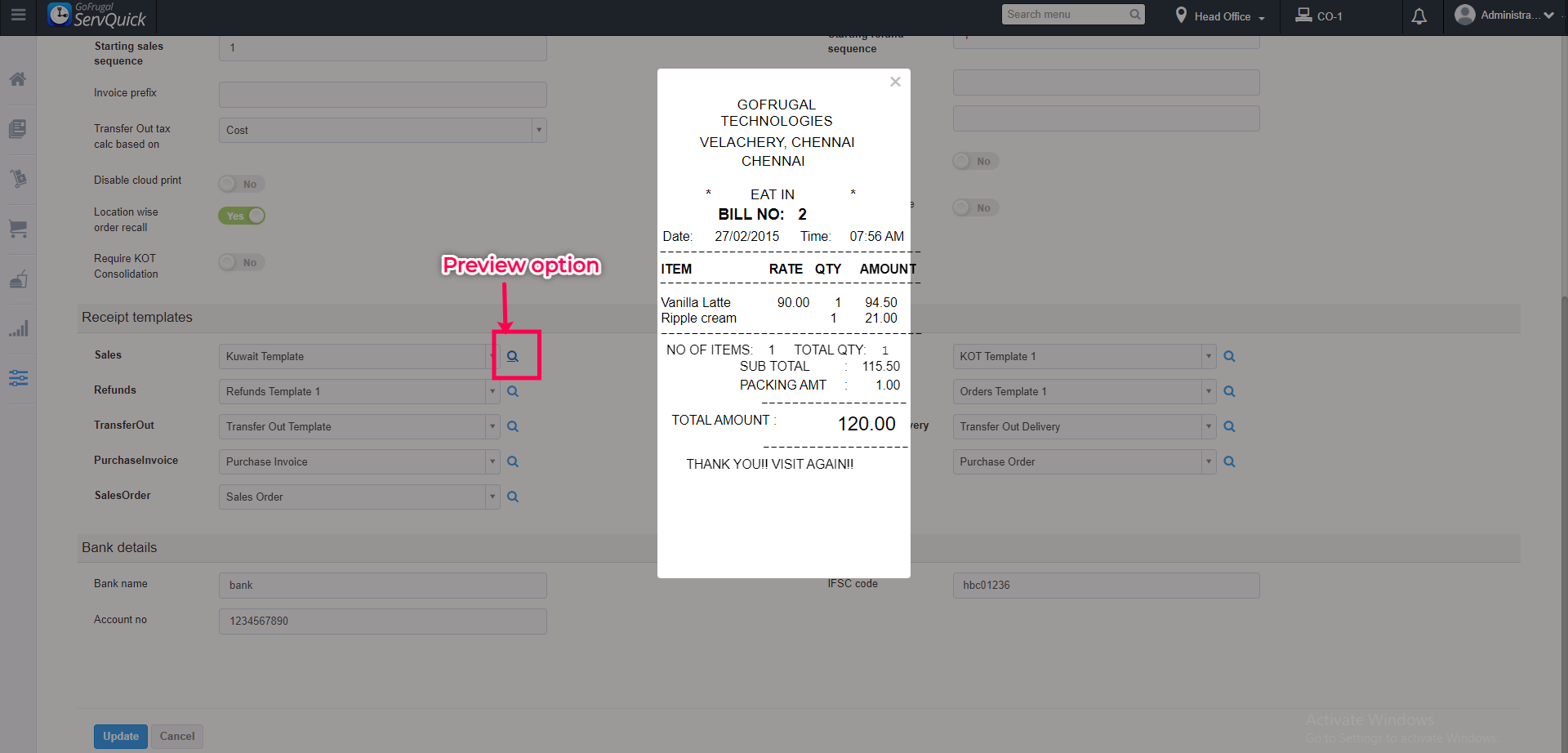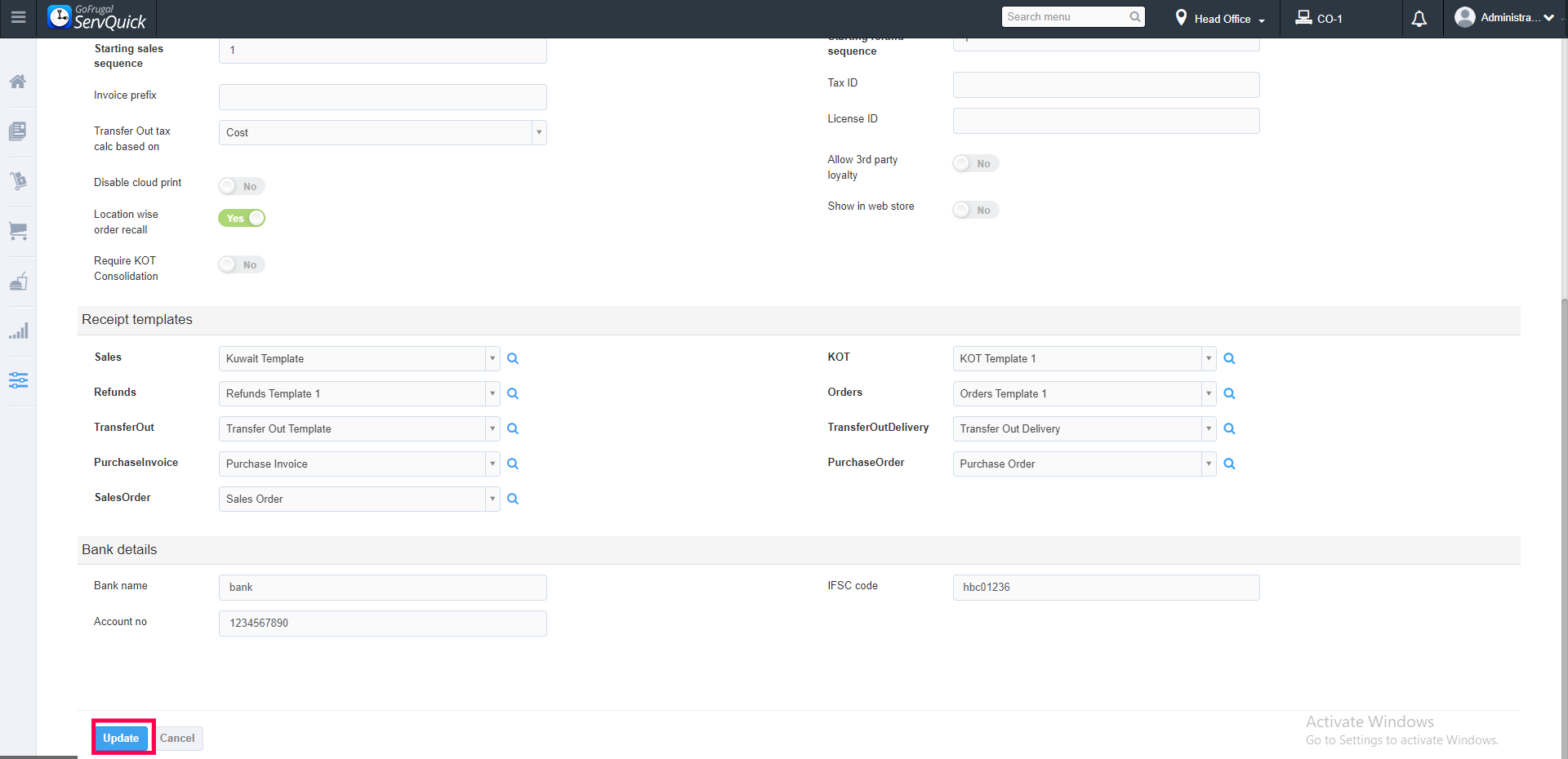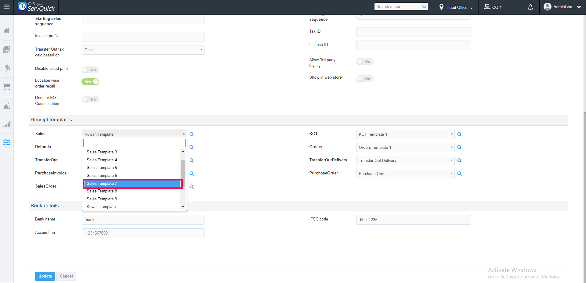 --> Here you can map the updated template for receipt, KOT, Refund, Purchase,Transfer out, PO & SO, Choose the template from the drop-down and Update