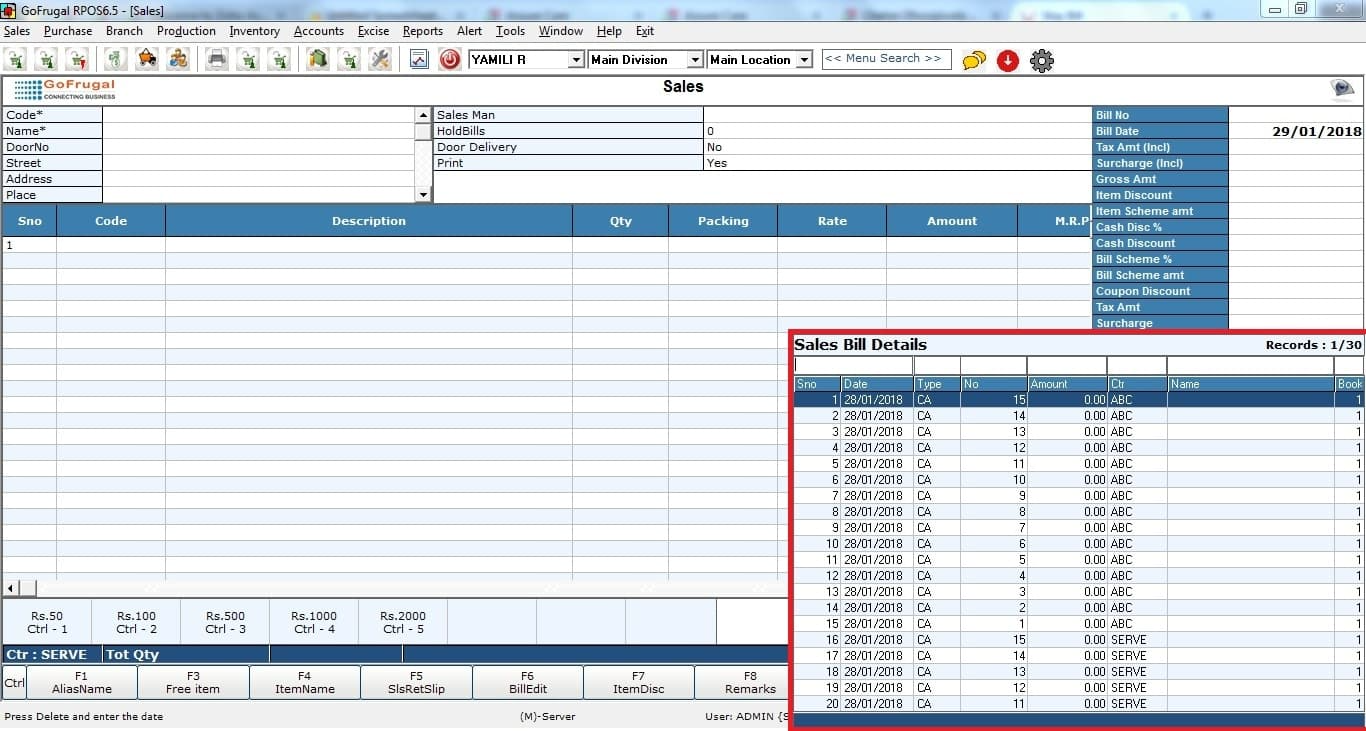 Select any skipped bill to enter the item details, customer, and payment details (tender).