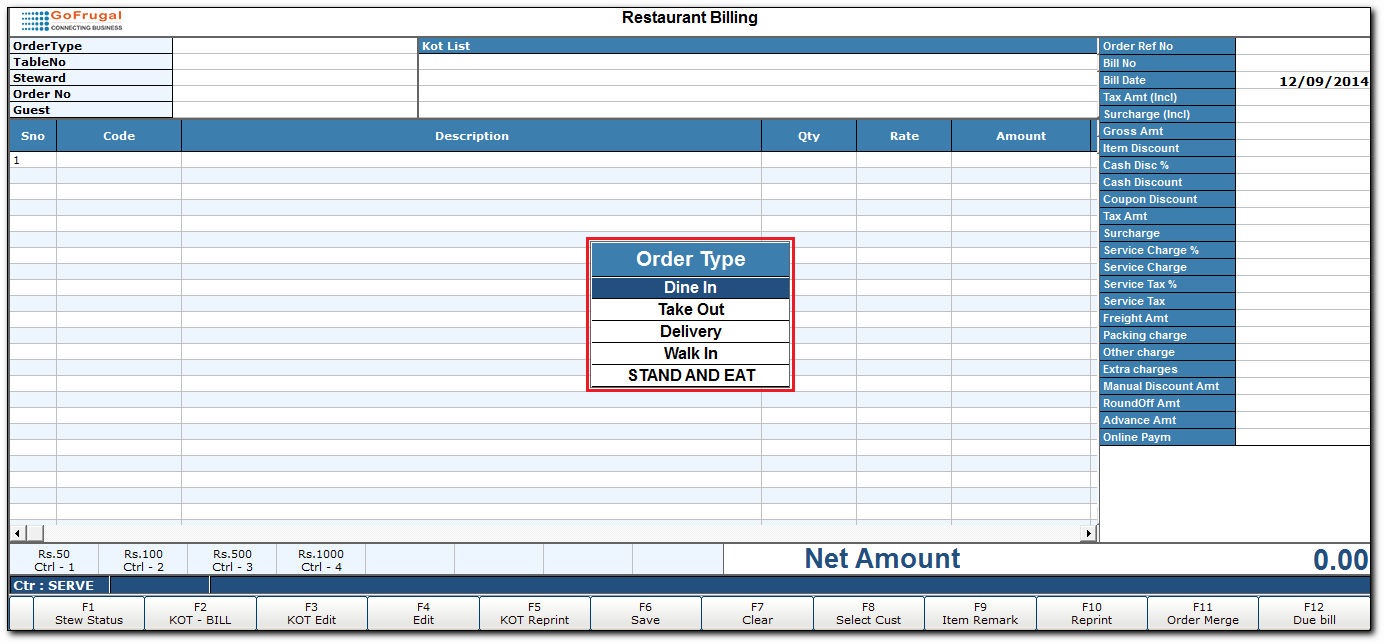 2. The Restaurant Billing screen is displayed.