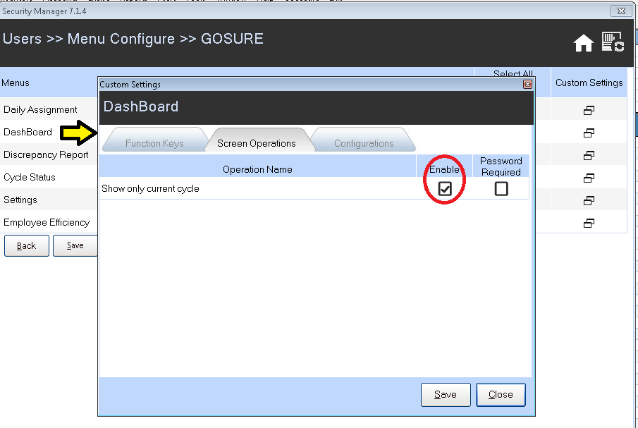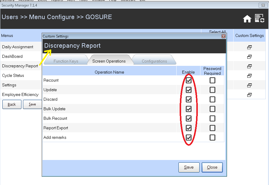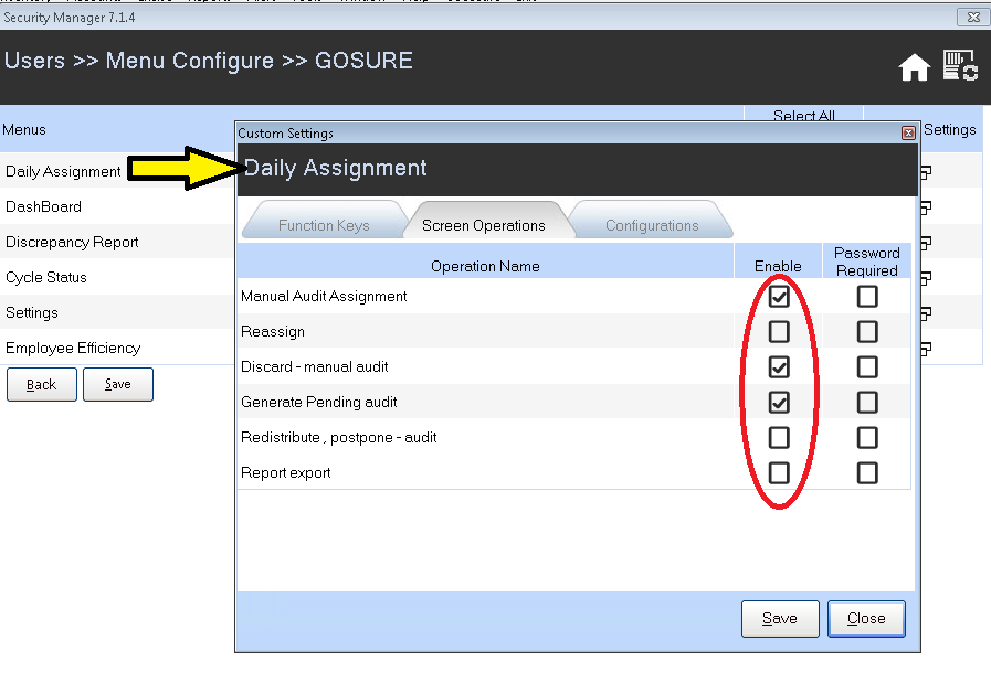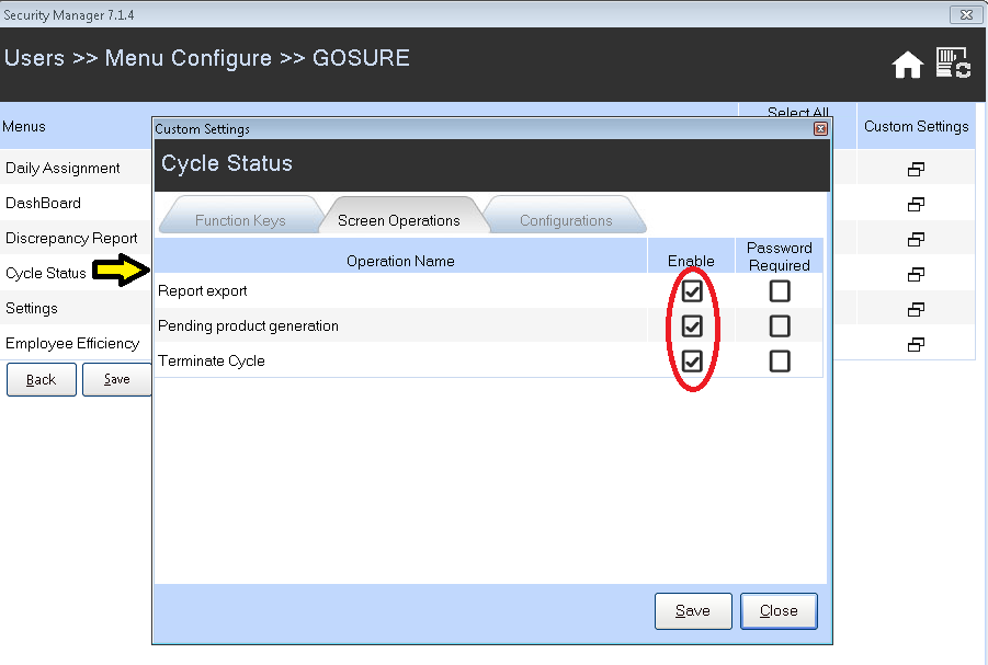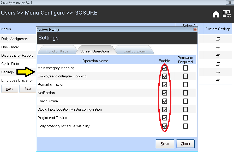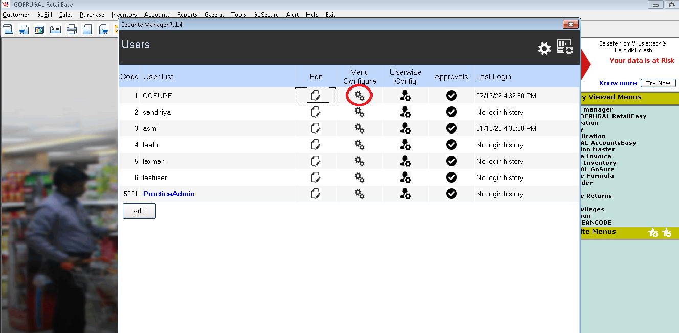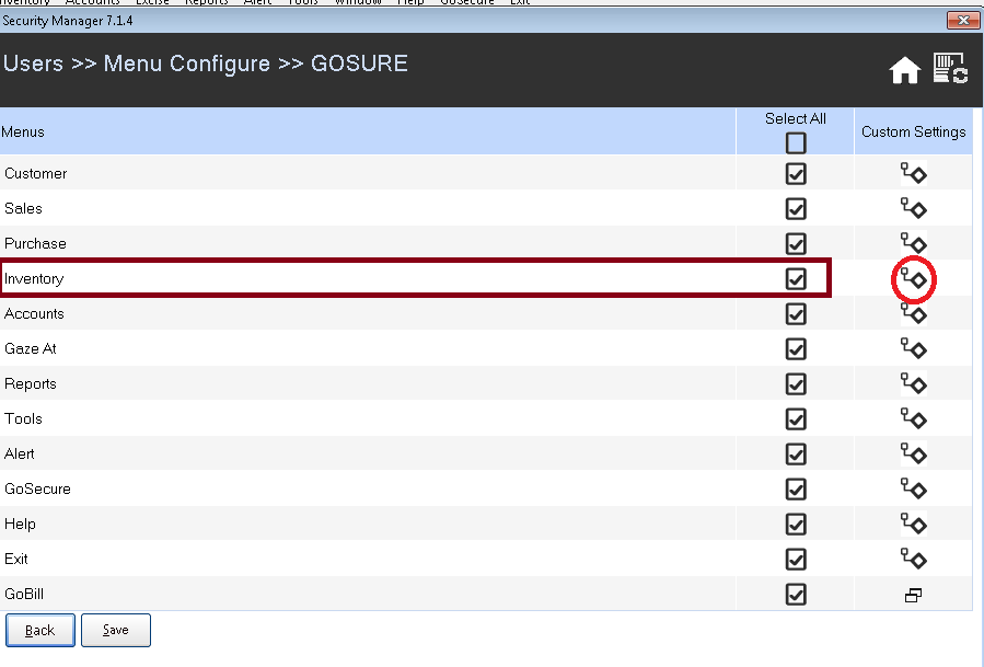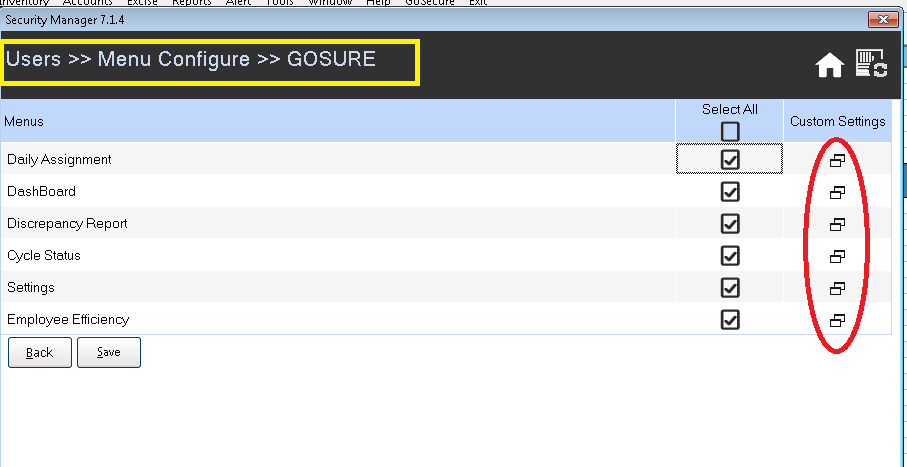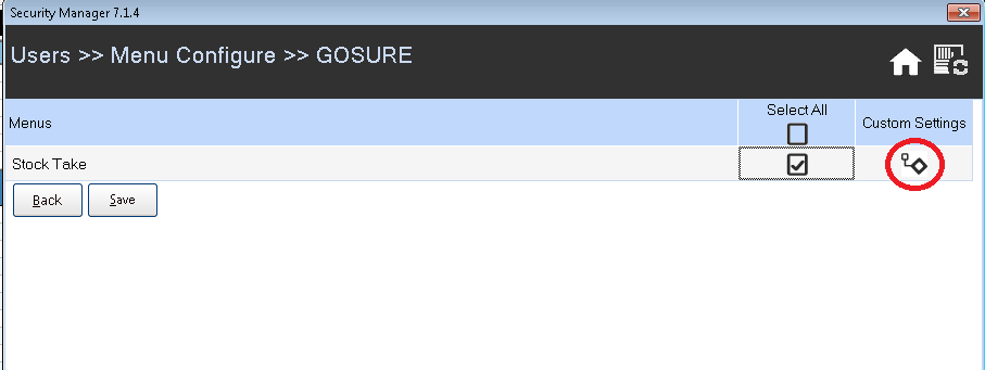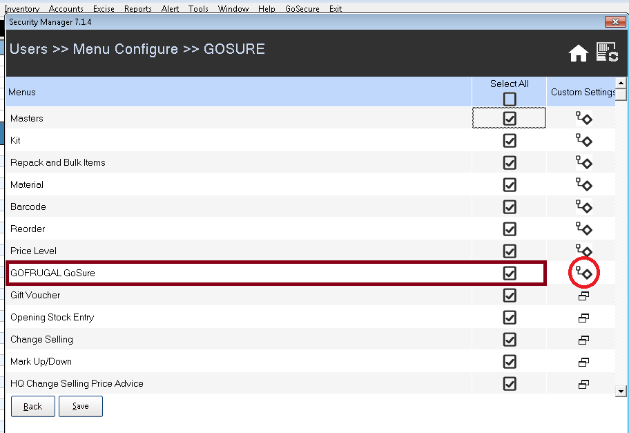 Step 1: Go to Tools --> Security controller --> Security manager. You will see a list of users displayed as shown in the below image. Click on "Menu configure" icon against the users mapped for GoSure.