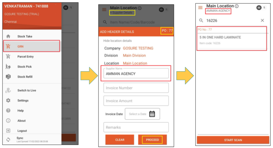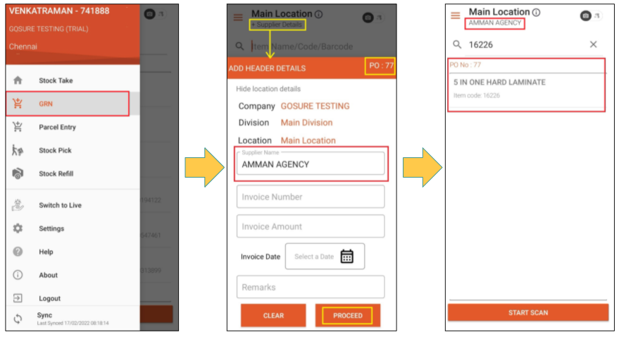 Step 1: In the GRN module of GoSure, enter the Supplier Details by clicking on "+Supplier Details" button at the top of the screen, select the PO from the selected supplier by clicking on the "+PO" button at the right end of 'Add Header Details' tab and click on 'Proceed'. Now, select the item(s) from the particular supplier for the selected PO.