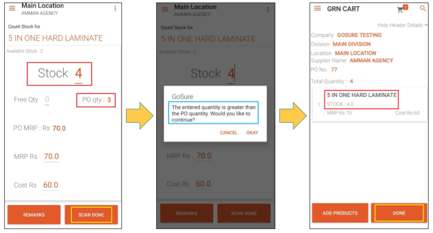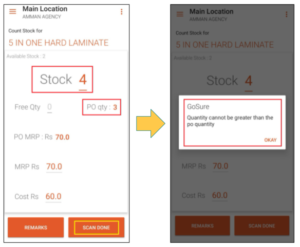 Step 2: Scan the stock of the selected item and you will observe that a pop-up appears, when the GRN quantity is greater than the PO quantity.