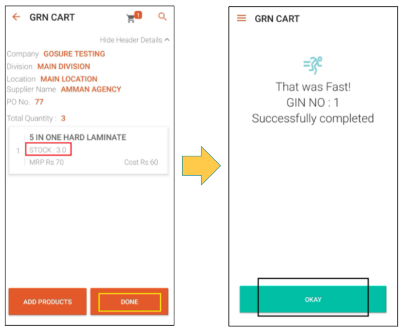 Step 3: If the GRN quantity is corrected such that it is either less than or equal to the PO quantity, then the stock will be confirmed and added to the cart. From the below image, it is evident that the GIN can be submitted now after matching the GRN quantity with PO quantity.