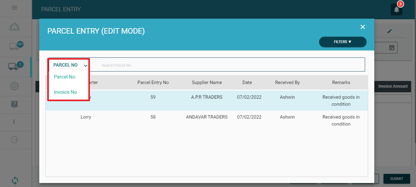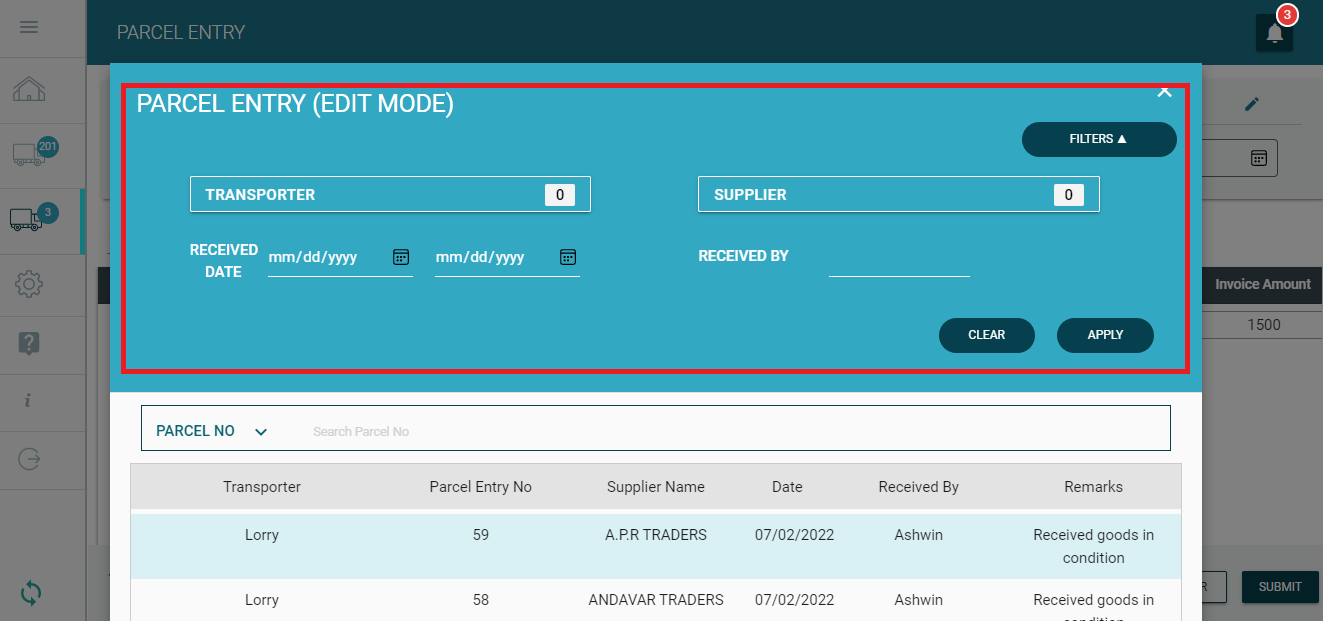 Step 4: To view the parcel entry by applying filters, click on "Filters" button at the top and apply the filter based on your choice: Transporter, Supplier, Received date, Received By and click on "Apply".
