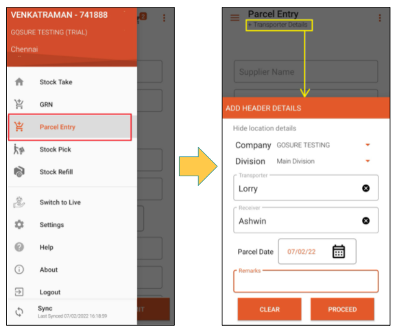 Step 1: In the GoSure mobile app, select the "Parcel entry" tab. In the Parcel Entry window, click on "Transporter Details" and in the 'Add Header Details. pop-up window, enter the Transporter name, Receiver, Parcel Received date and Remarks.