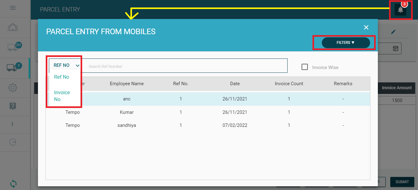 Step 5: If you want to check the parcel entry made from a mobile, click on "Notification" button at the top of the parcel entry screen. In the 'Parcel Entry from Mobiles' pop-up window, you can search the parcel entry based on two of the following: Ref No, Invoice No.