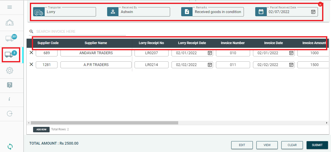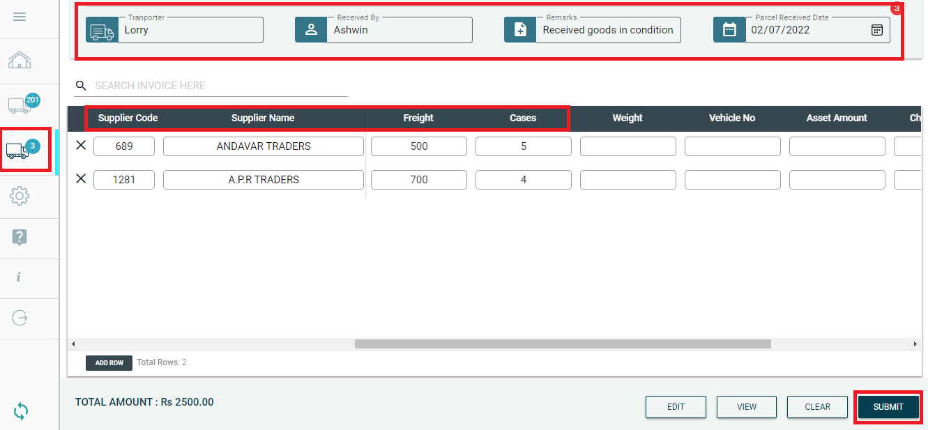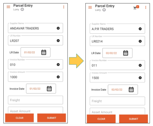 Step 2: For the selected transporter, fill in the individual parcel entries from each supplier by entering the mandatory fields Supplier name, LR number, LR Date, Invoice number, Invoice amount, Invoice date, Cases and also other fields which are not mandatory. Each entry will be added to the cart.