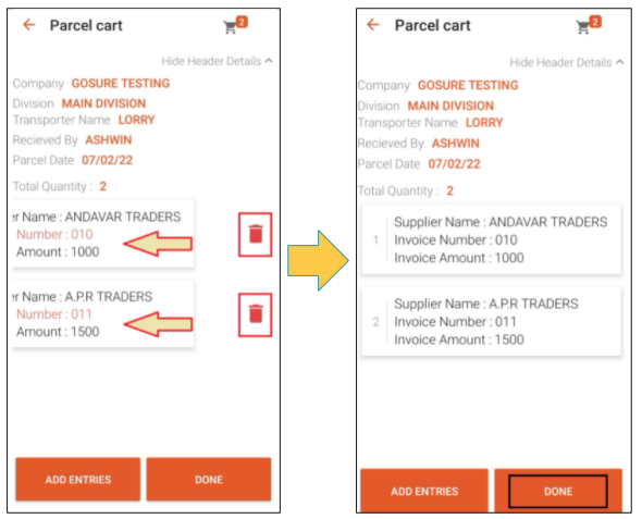 Step 3: Click on the "Cart" icon at the top to view the items added to the cart. You can delete the item, by swiping to the left and clicking on the Trash button on the right against each item. Finally, click on "Done" to submit the parcel entry.