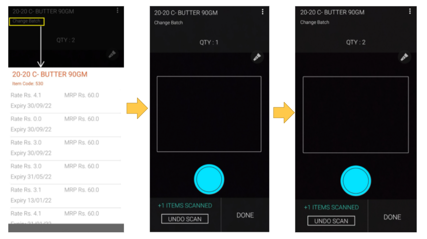 Step 3: To scan a different batch of the same item, click on 'Change Batch', select the batch and proceed to scan. Now, you can scan the items of the selected batch continuously.