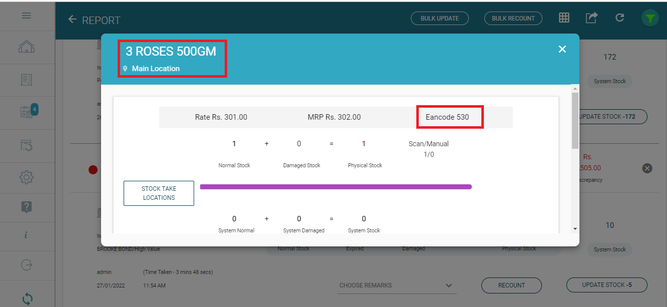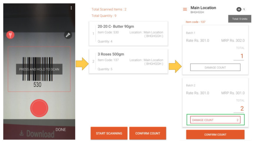 Step 6: To make the stock count of damaged items, click on the broken bottle-like icon in the scanning screen and start scanning. By clicking on the specific item, you can view the damage count and the batch of items in which damage was there.