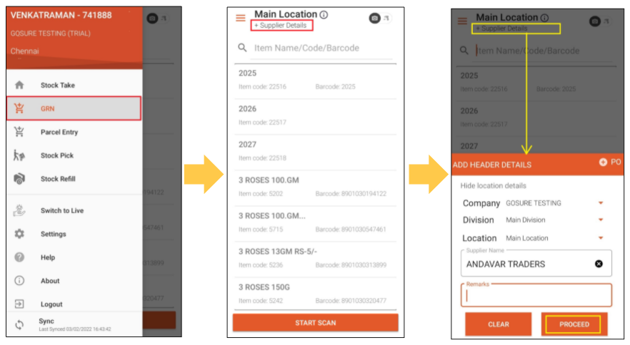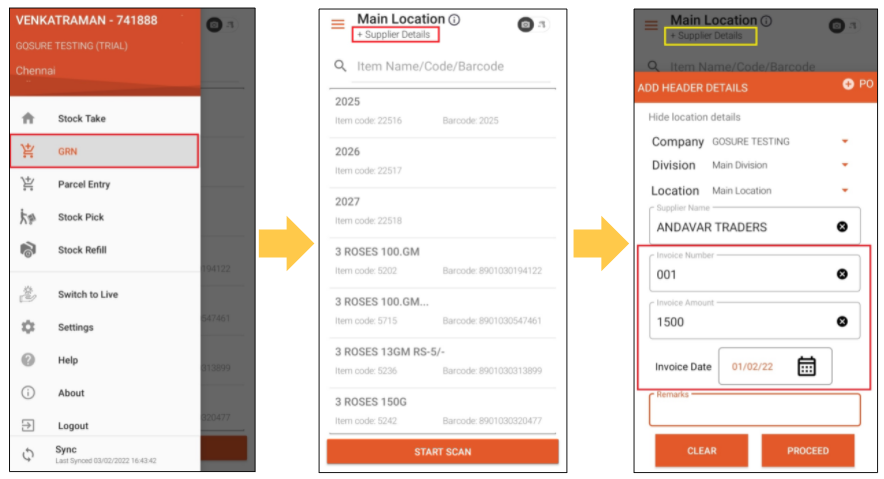 Conclusion: By following the above steps, the GRN manager can either enable or disable the visibility of Invoice No, Invoice amount and Invoice date fields to the GRN pickers in the GoSure mobile app.