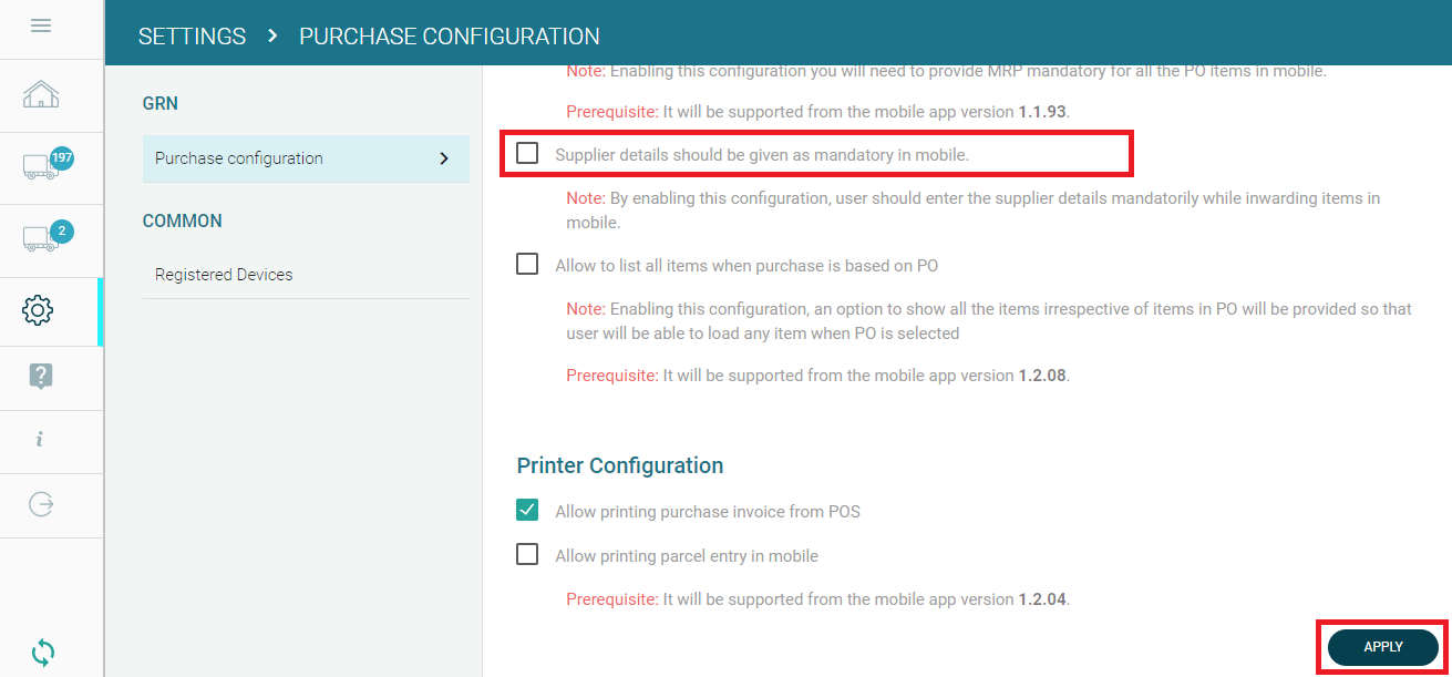 Step 1: In the GoSure GRN web app, enable the option "Supplier details should be given as mandatory in mobile" and click on "Apply".