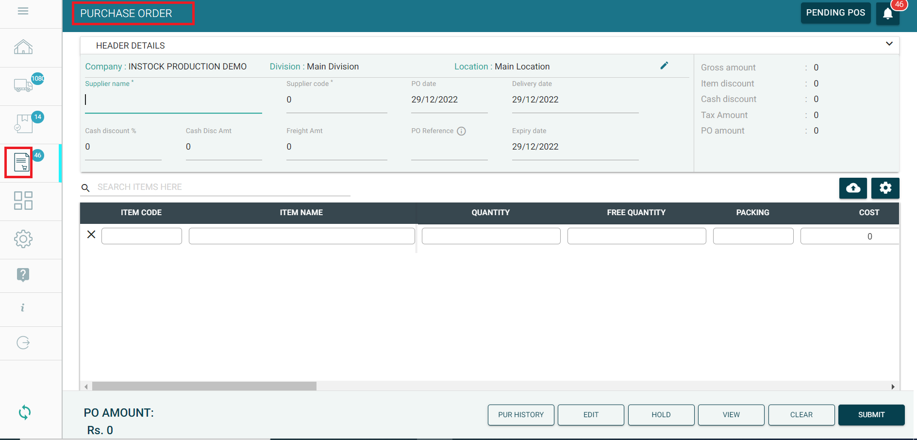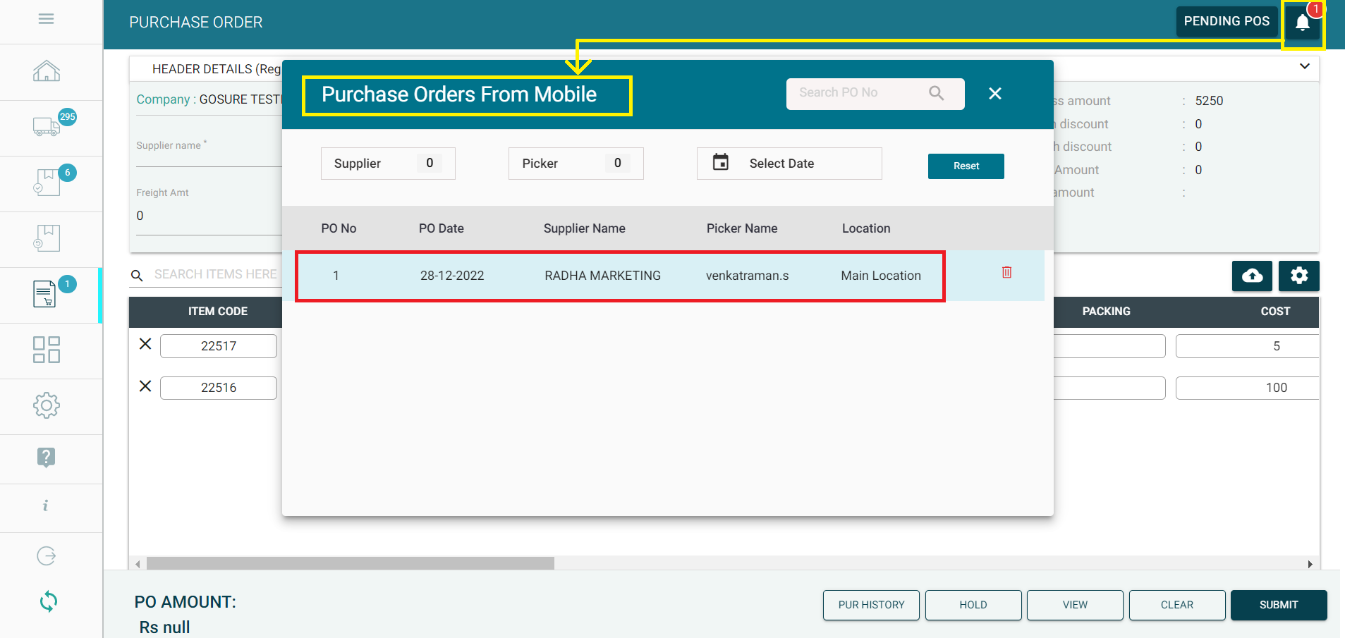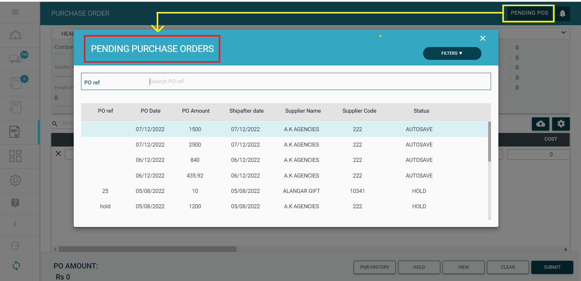 Step 12: Click on "PENDING POS" button at the top right, to load the list of Purchase Orders kept on Hold. Once the required PO is selected from the list, it will be loaded in the Purchase Order screen again, after which you could proceed with reviewing and submitting the Purchase Order.