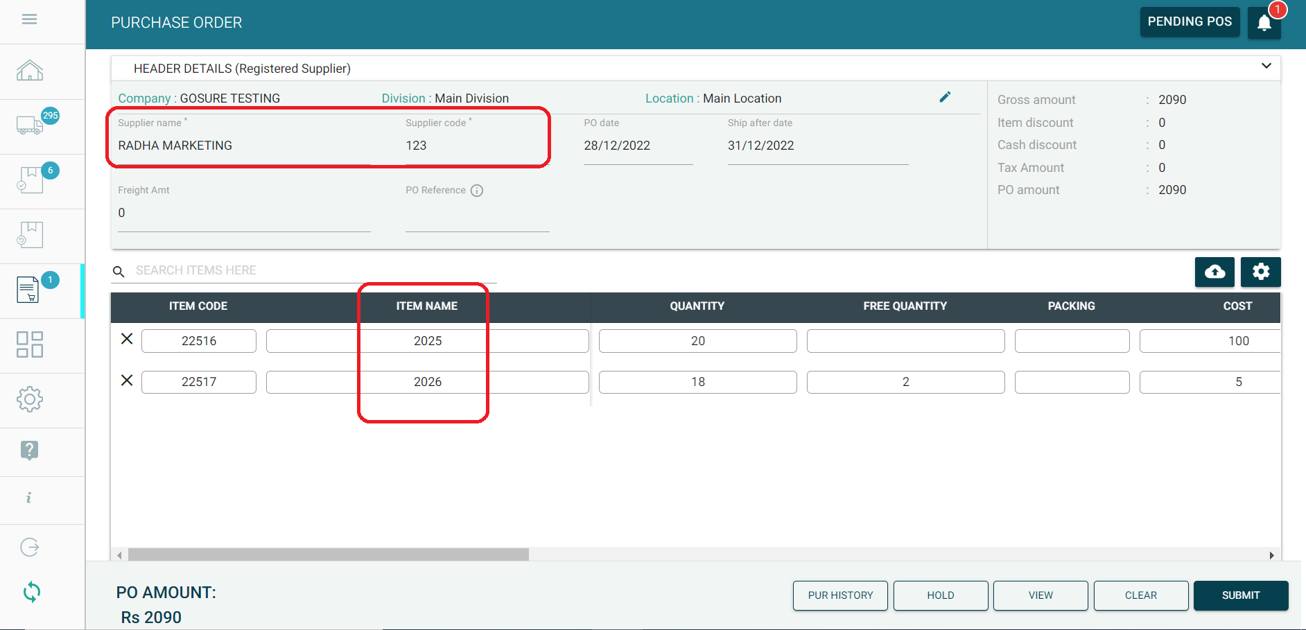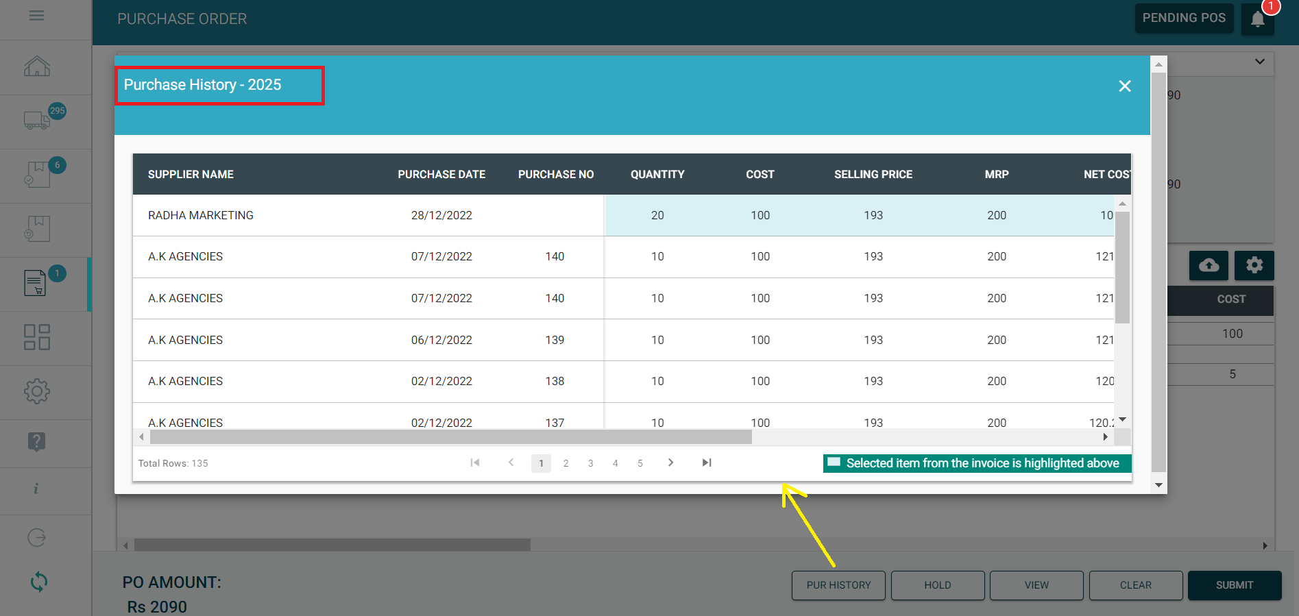Step 11: You can see the Purchase History of an item by placing the cursor on the required item, and press the button "PUR HISTORY". You will see the complete purchase history details for the selected item, that includes, Supplier Name, Purchase Date, PO No., Quantity, Cost, Selling Price, MRP, Net Cost, etc.