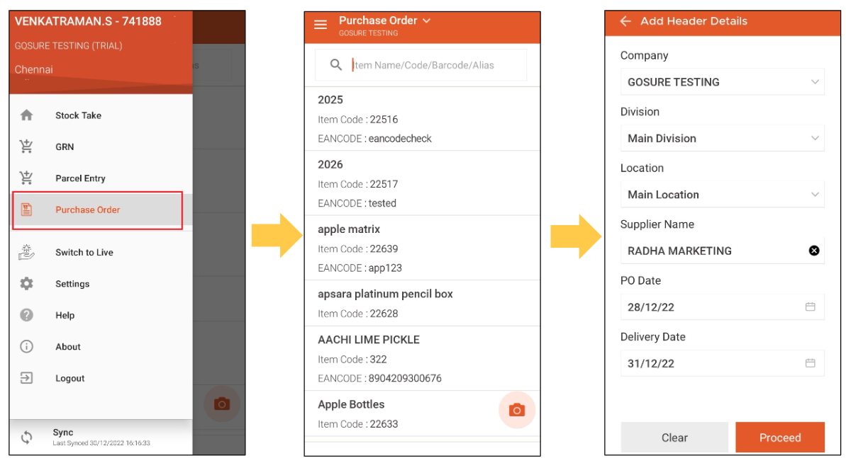 Step 1: To make a PO from GRN mobile app, click on the Menu icon on the top left, and choose the menu "Purchase Order". You will be able to see all the items listed on the screen.
