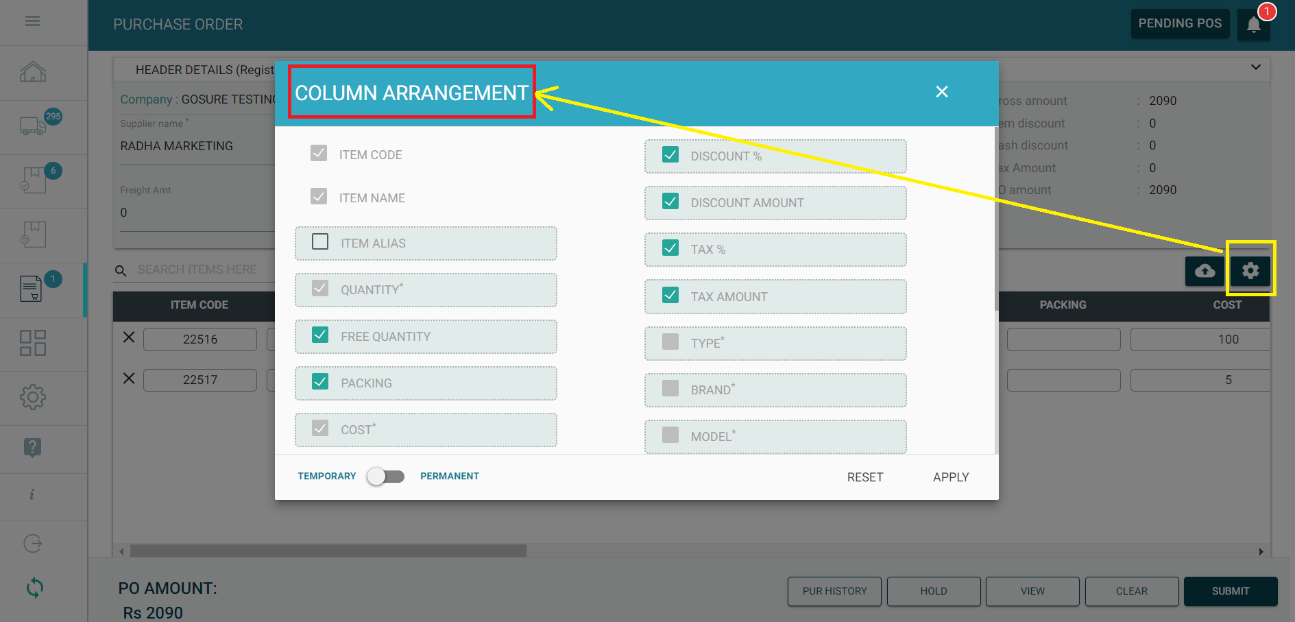 Step 10: You can customize the column to be shown in the Purchase Order screen by clicking on the Settings icon. In the "Column Arrangement" window that appears, select/deselect the column as required, and click on 'Apply'.