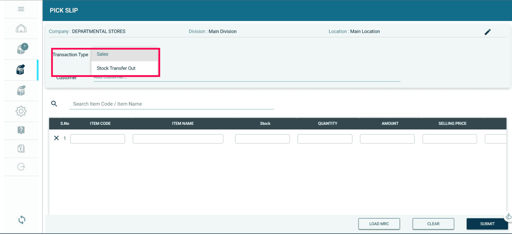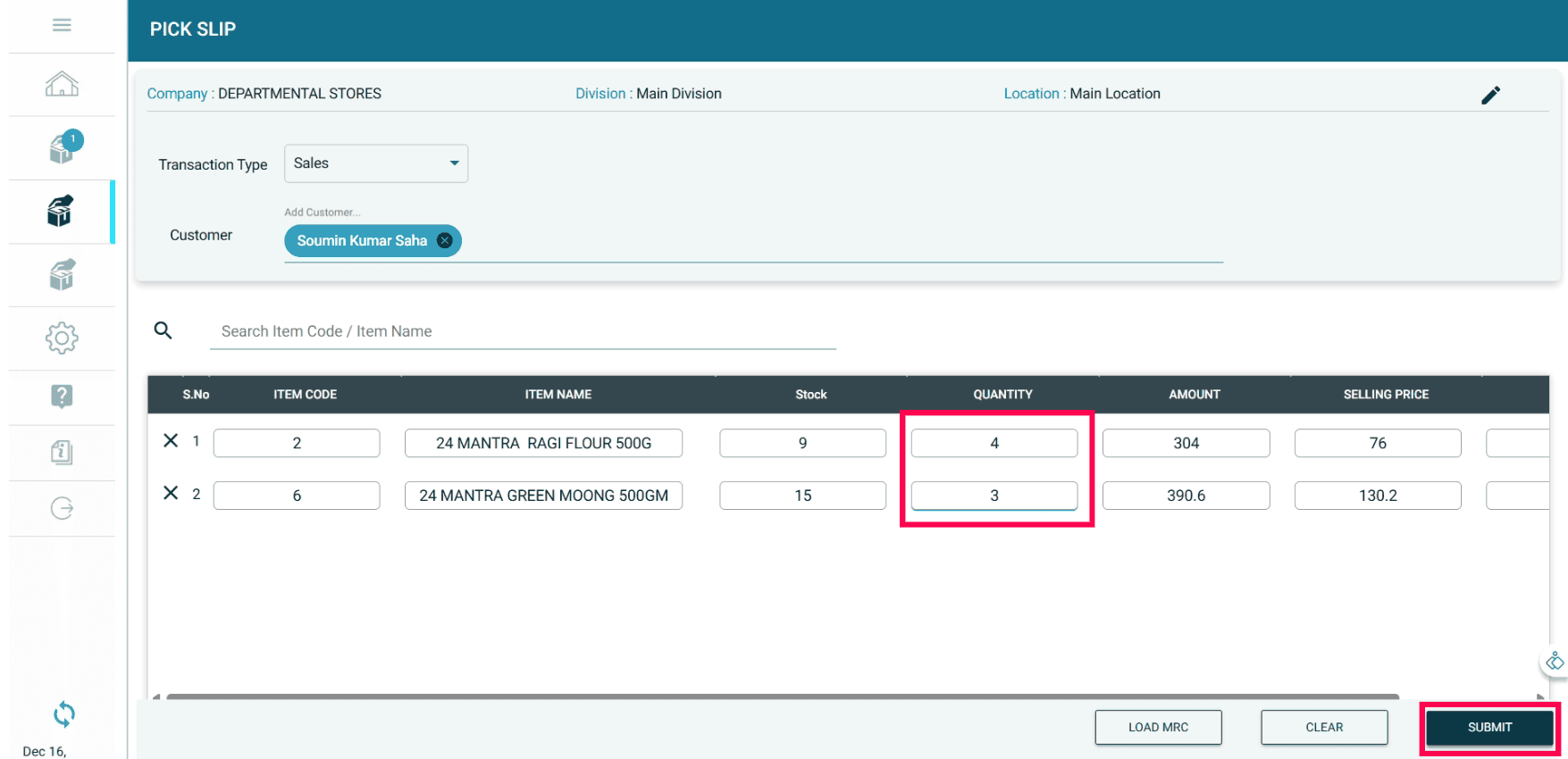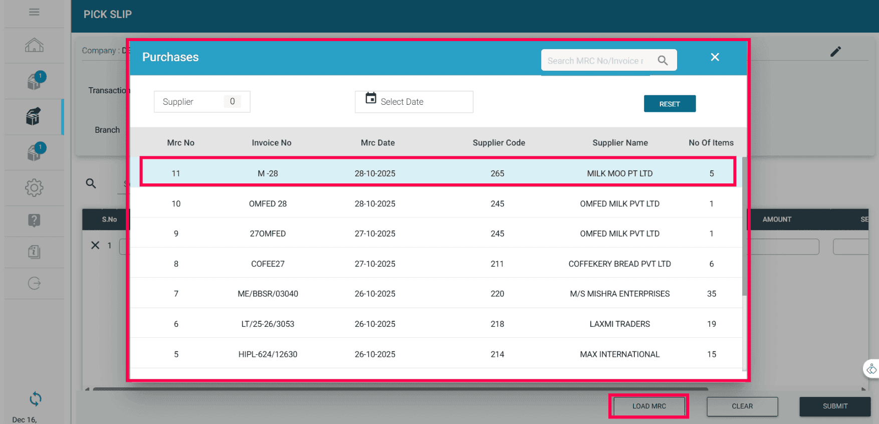 Click the LOAD MRC button, select the desired Invoice No from the list, and proceed with the transaction.