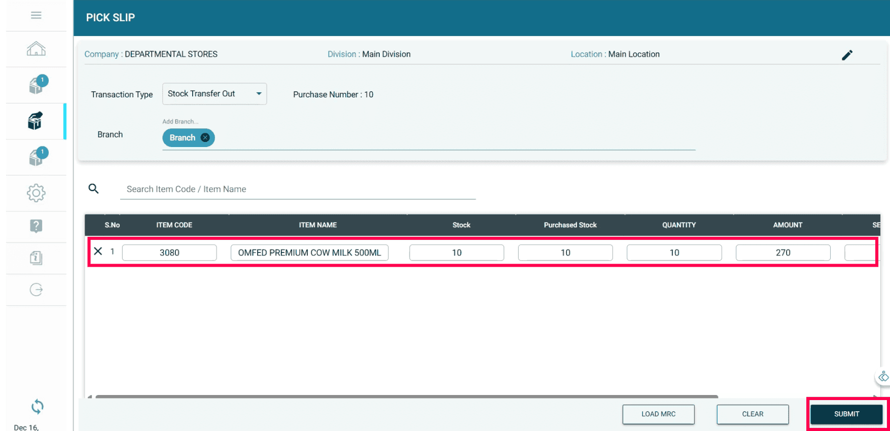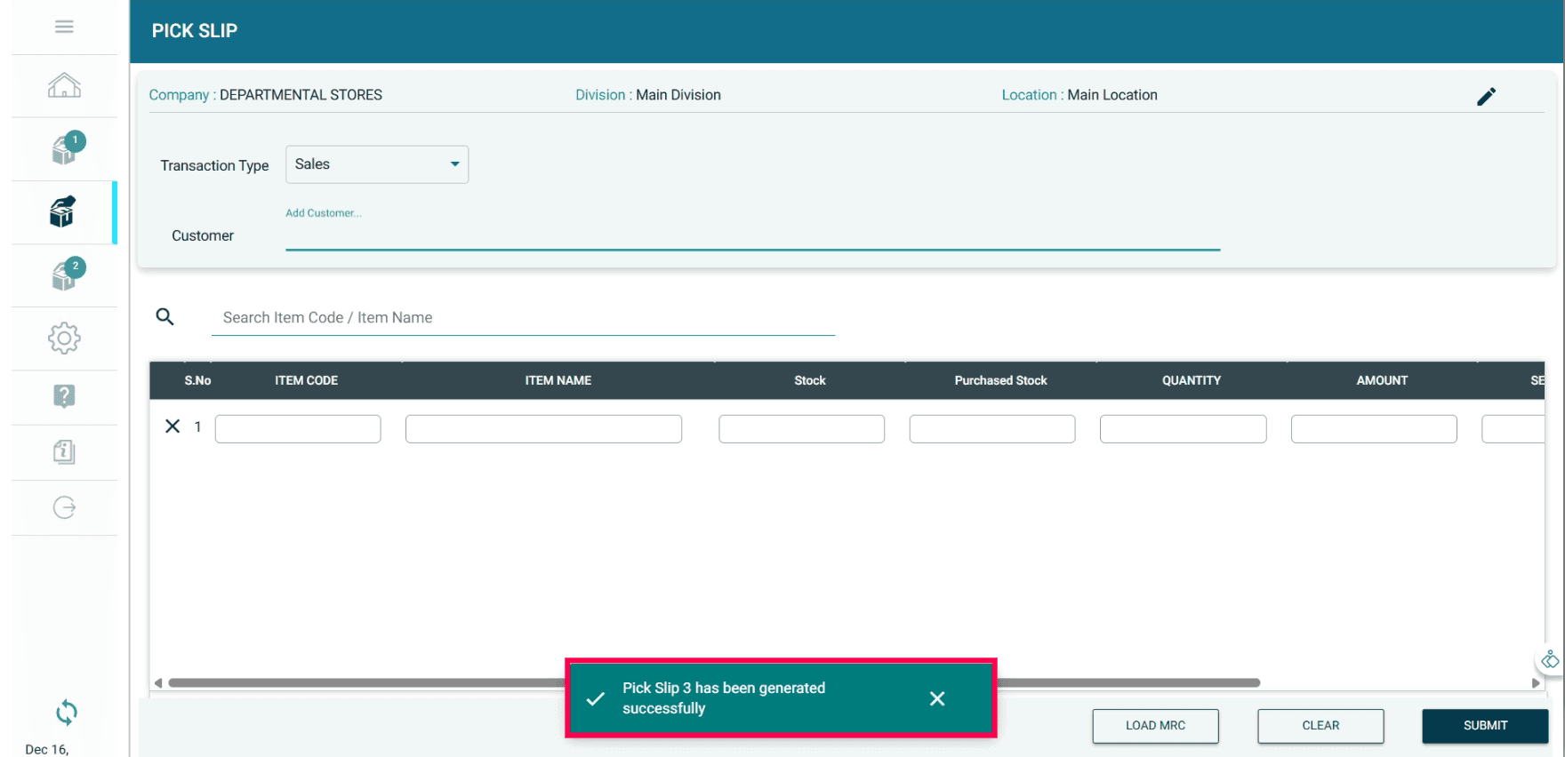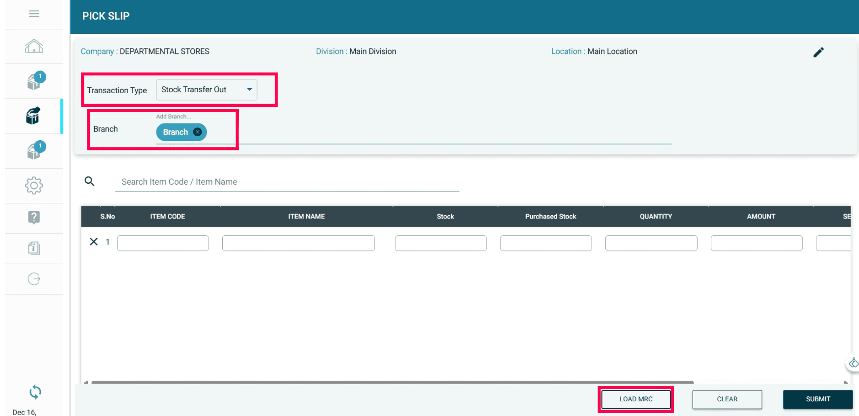 Click the LOAD MRC button, select the desired Invoice No from the list, and proceed with the transaction.