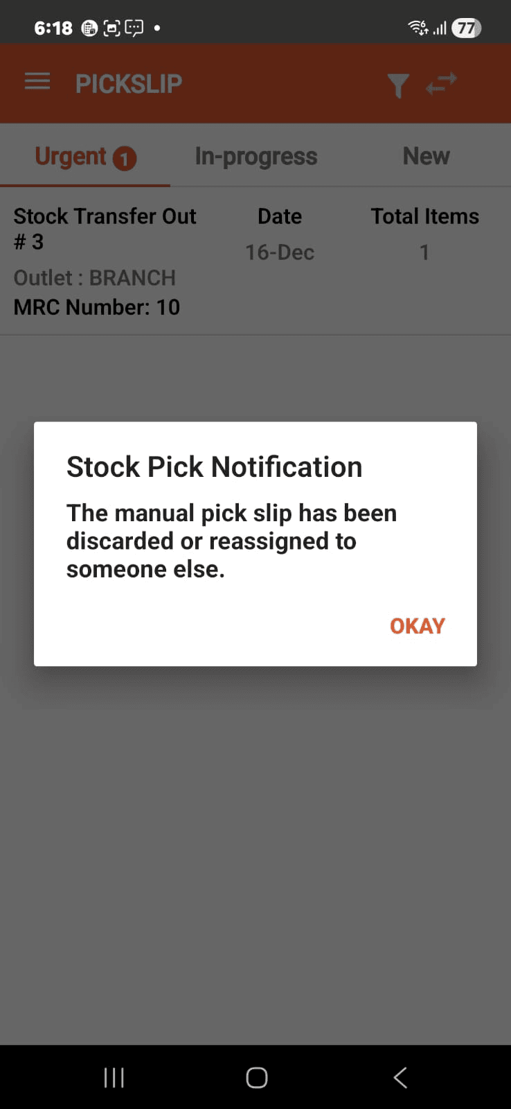 Note: If you reassign the stock pick work to someone else, this pop-up will appear.