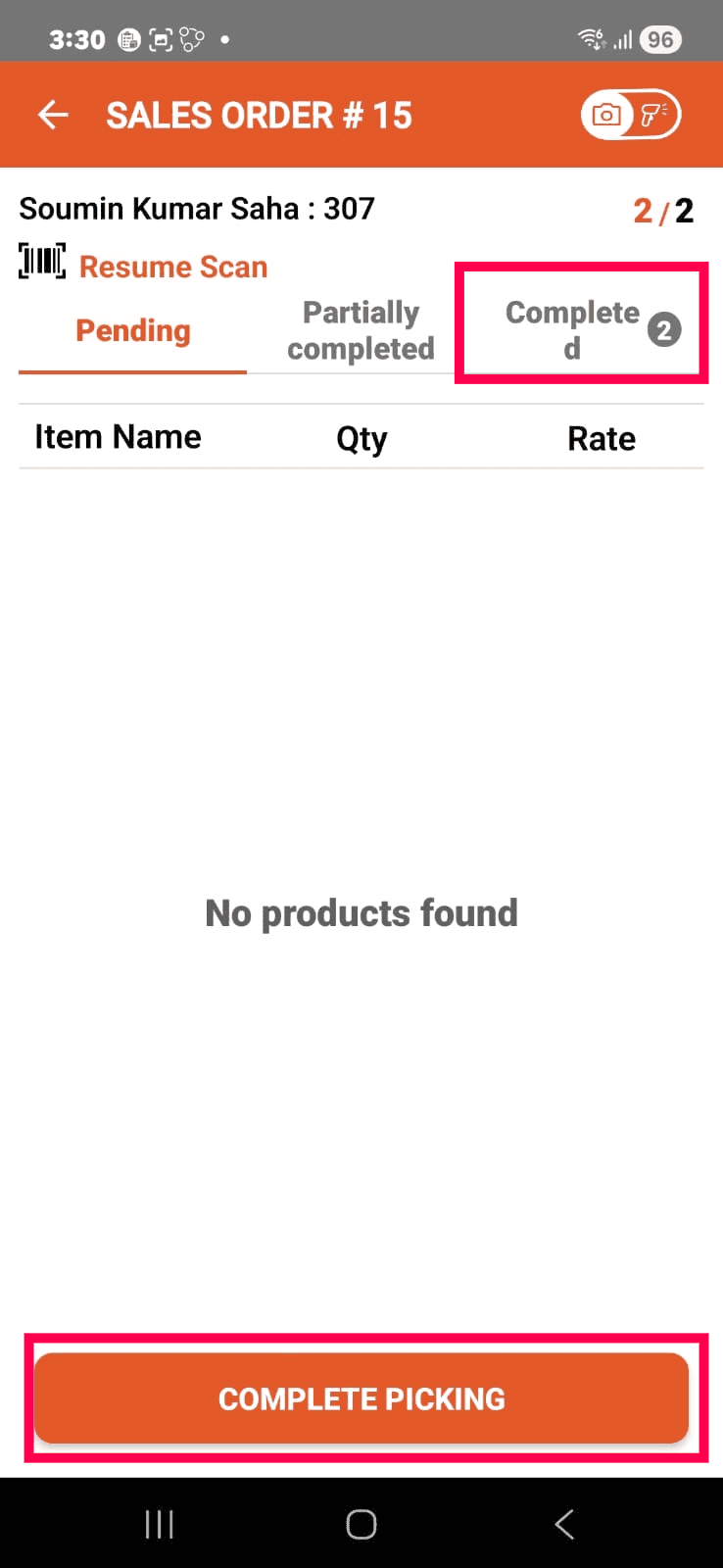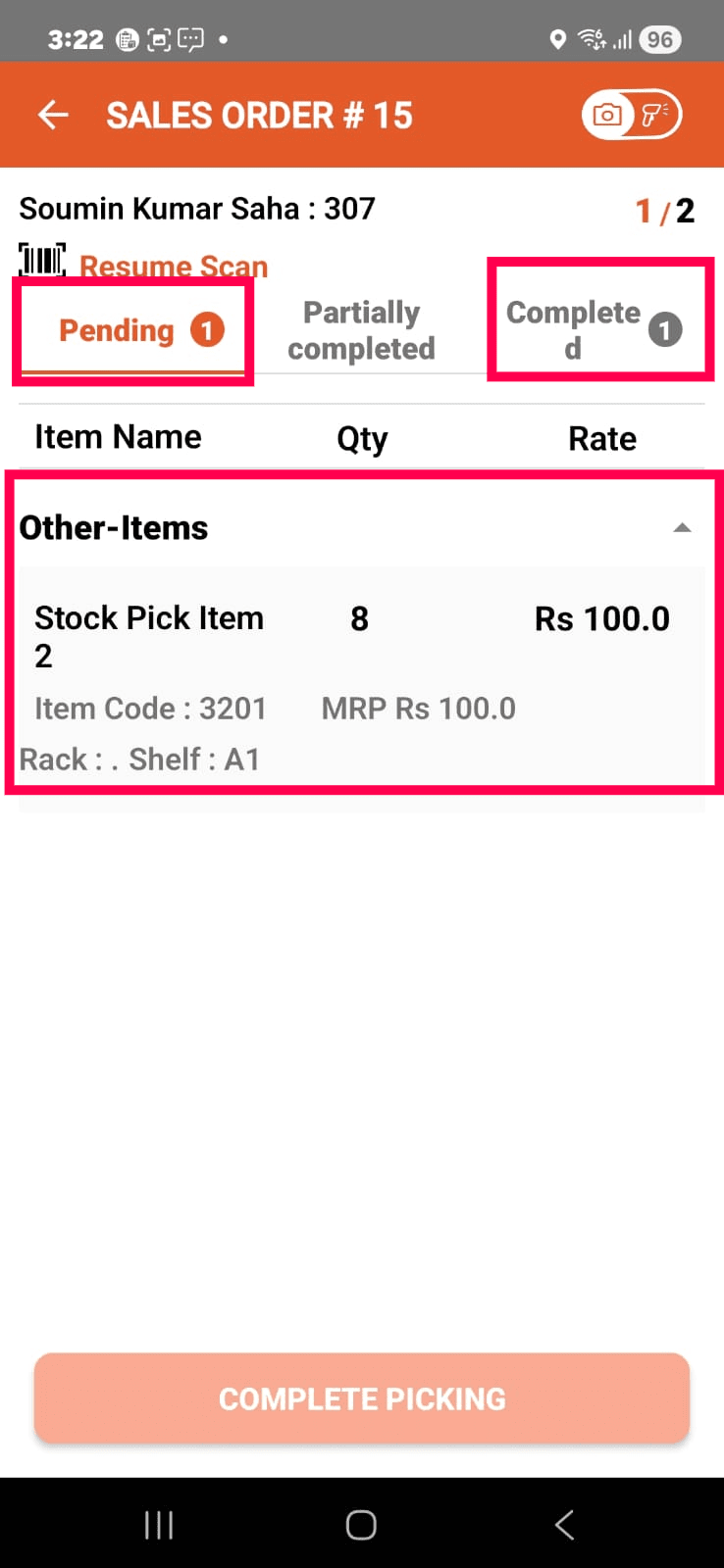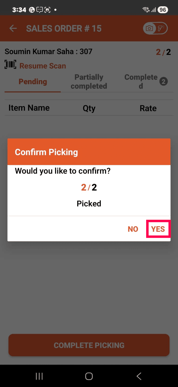 Tap the COMPLETE PICKING button.