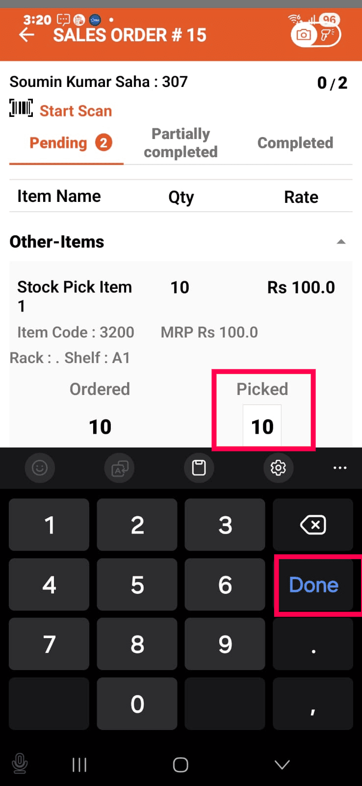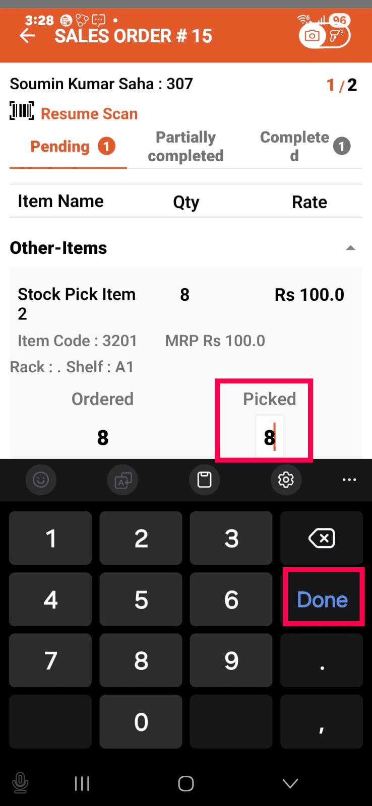 Put the quantity under the Picked quantity box.