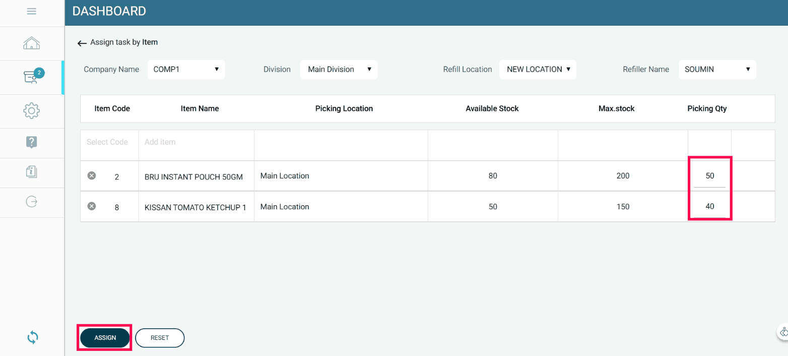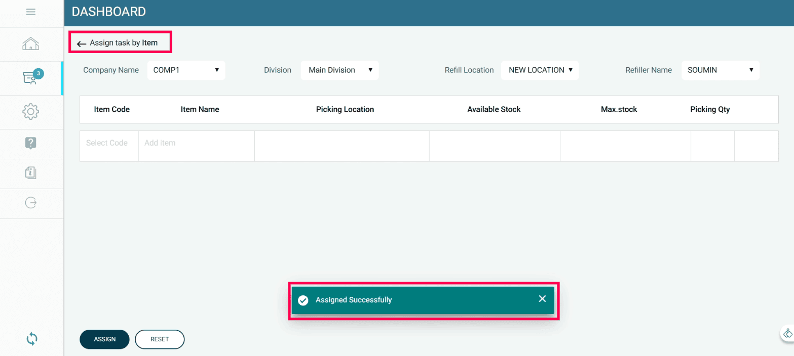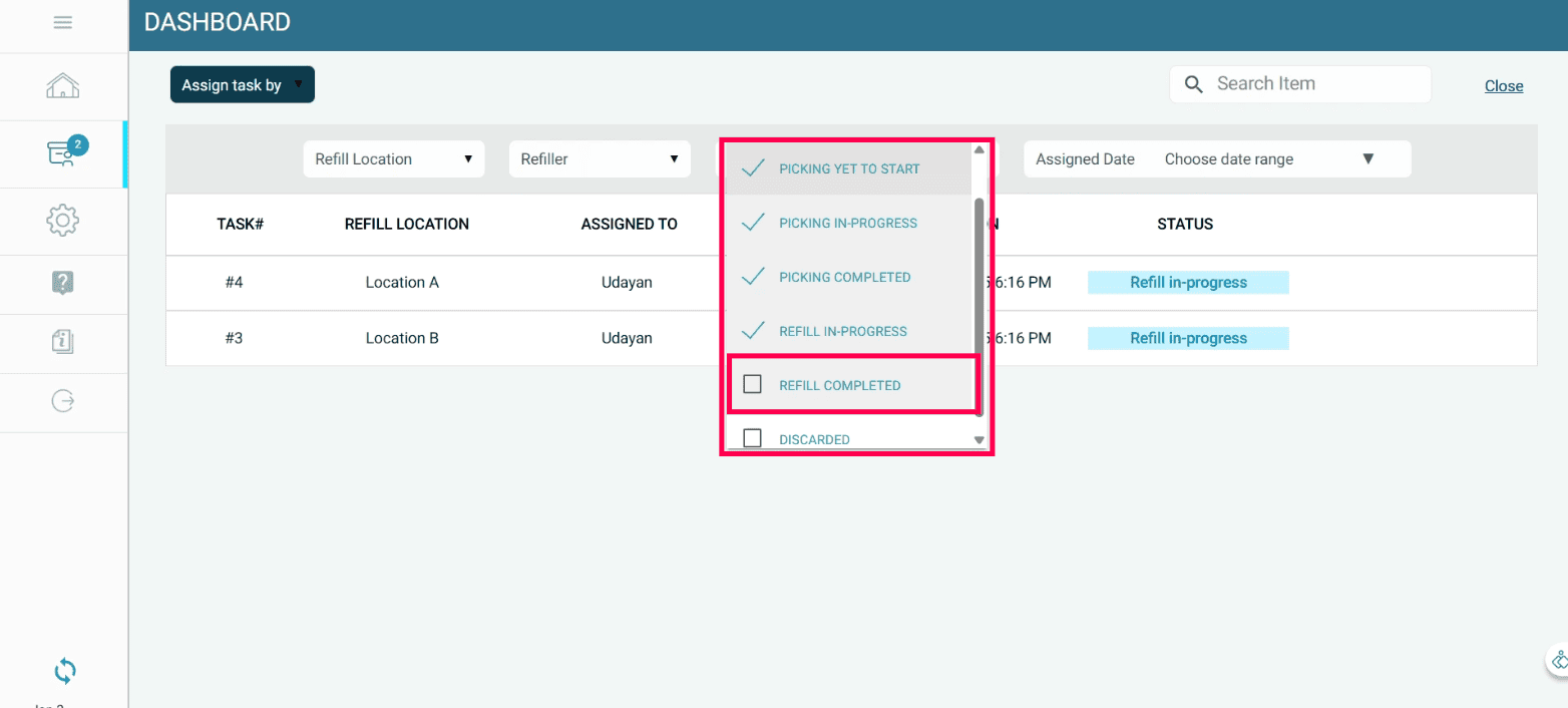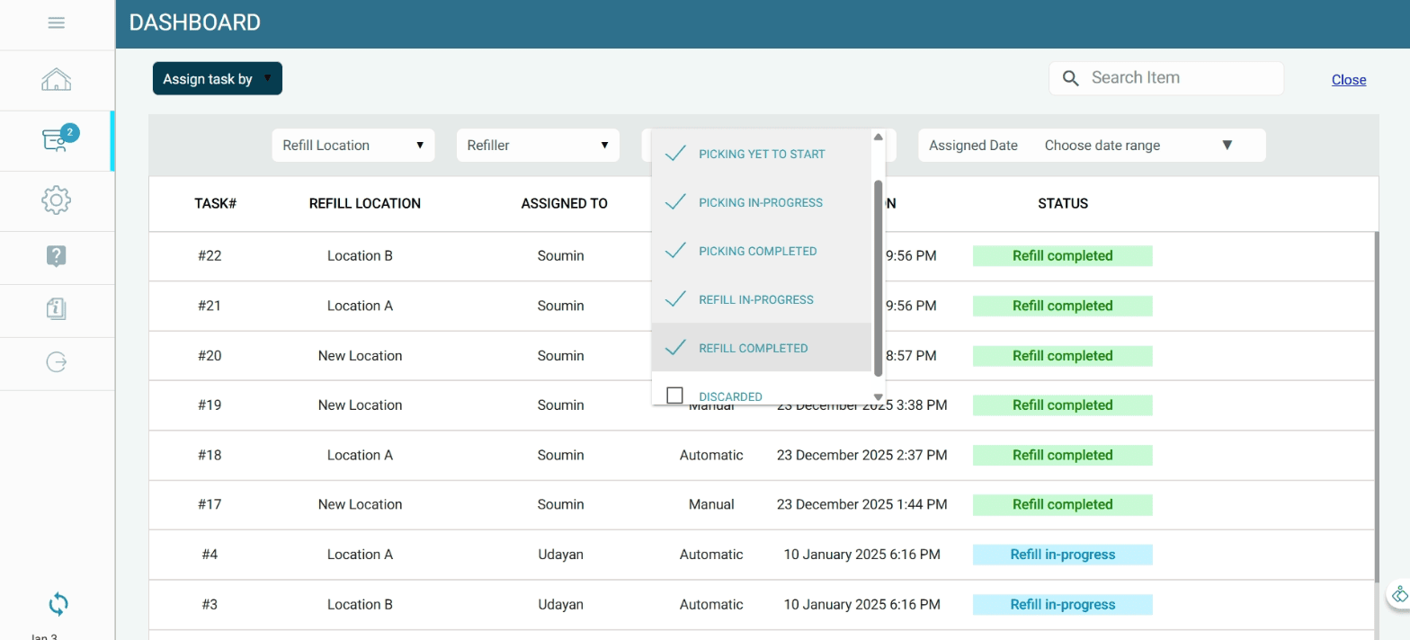 Once the task is completed, stock is automatically transferred from the godown to the respective refill location in the system, ensuring real-time inventory accuracy.