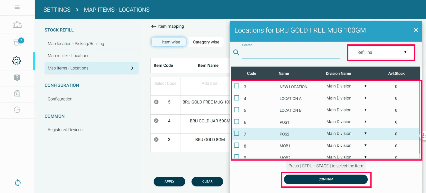 Select the Refill Locations. The refill location is where you will refill your stock when the stock is less than the minimum stock.