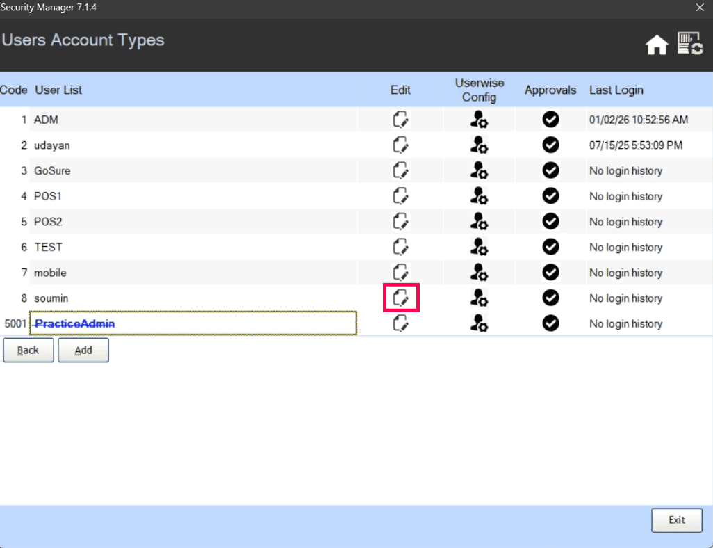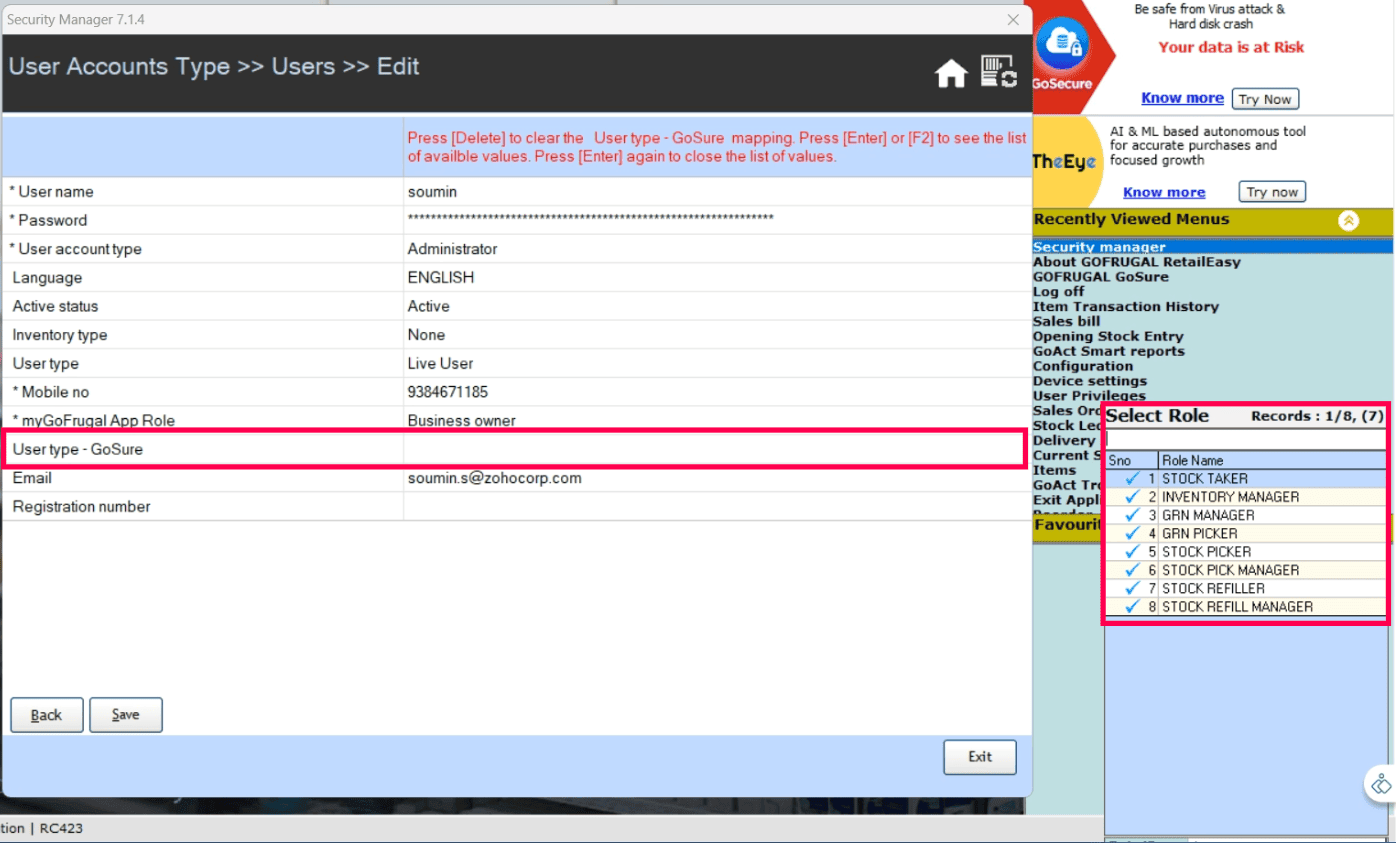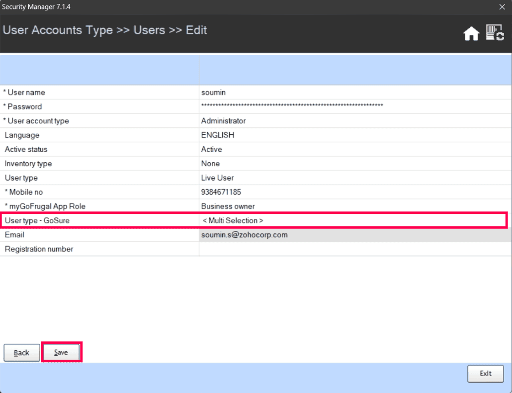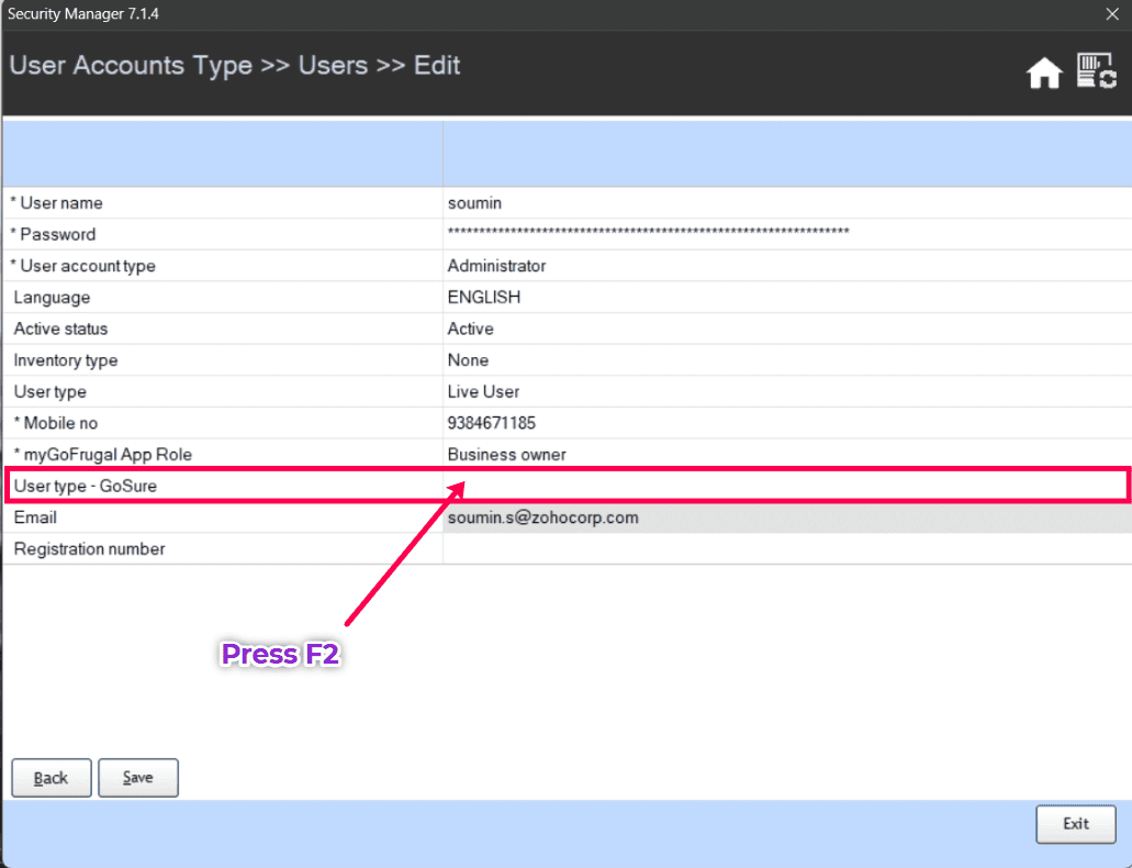 Locate User type - GoSure and press the F2 button.