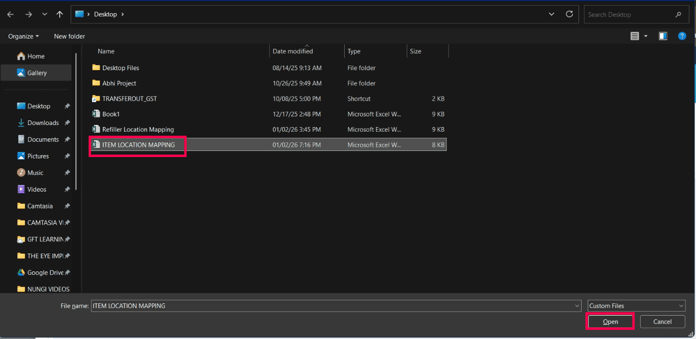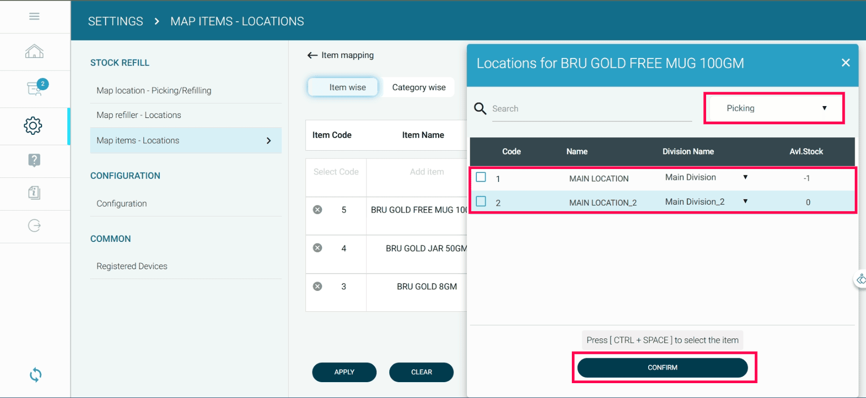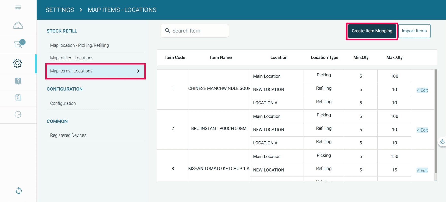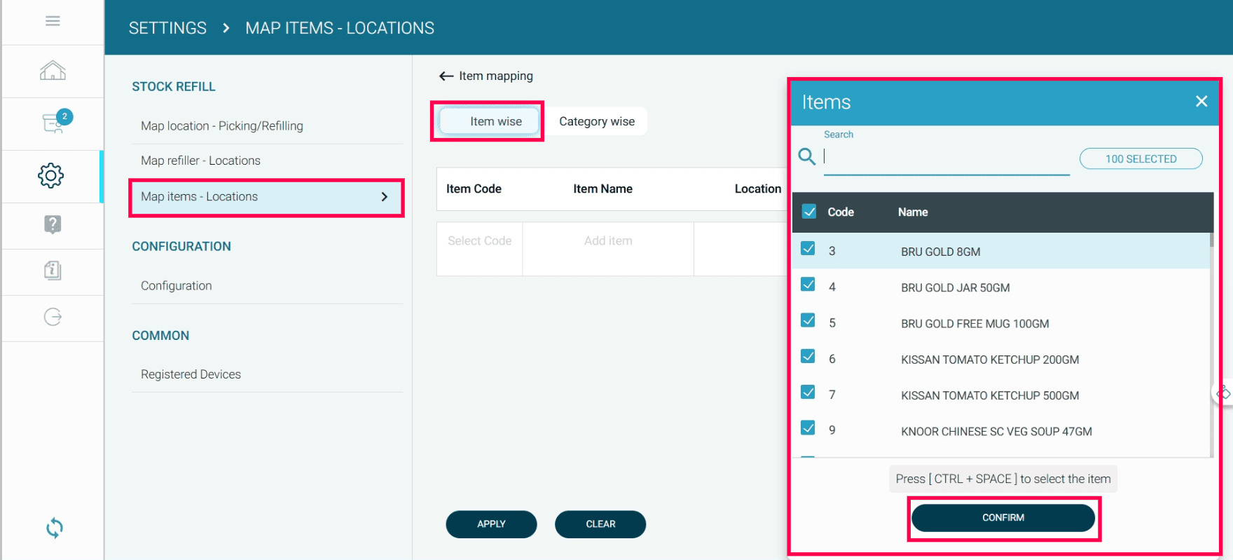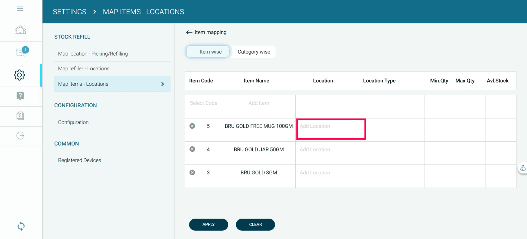 Click the Item wise button to map items with locations.