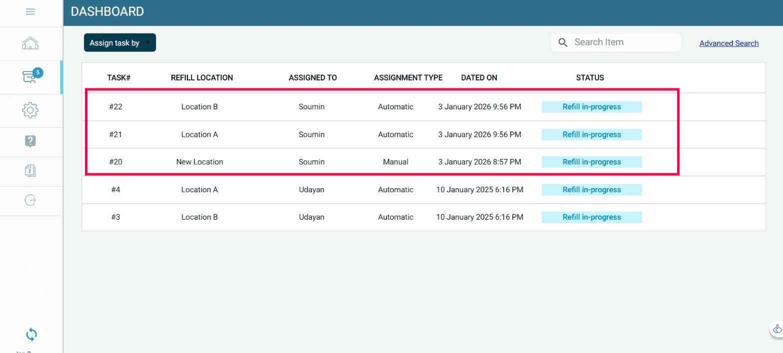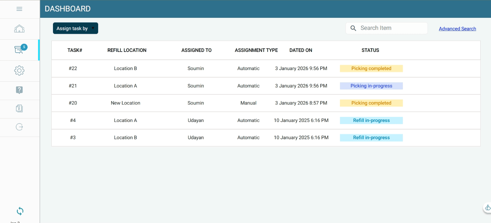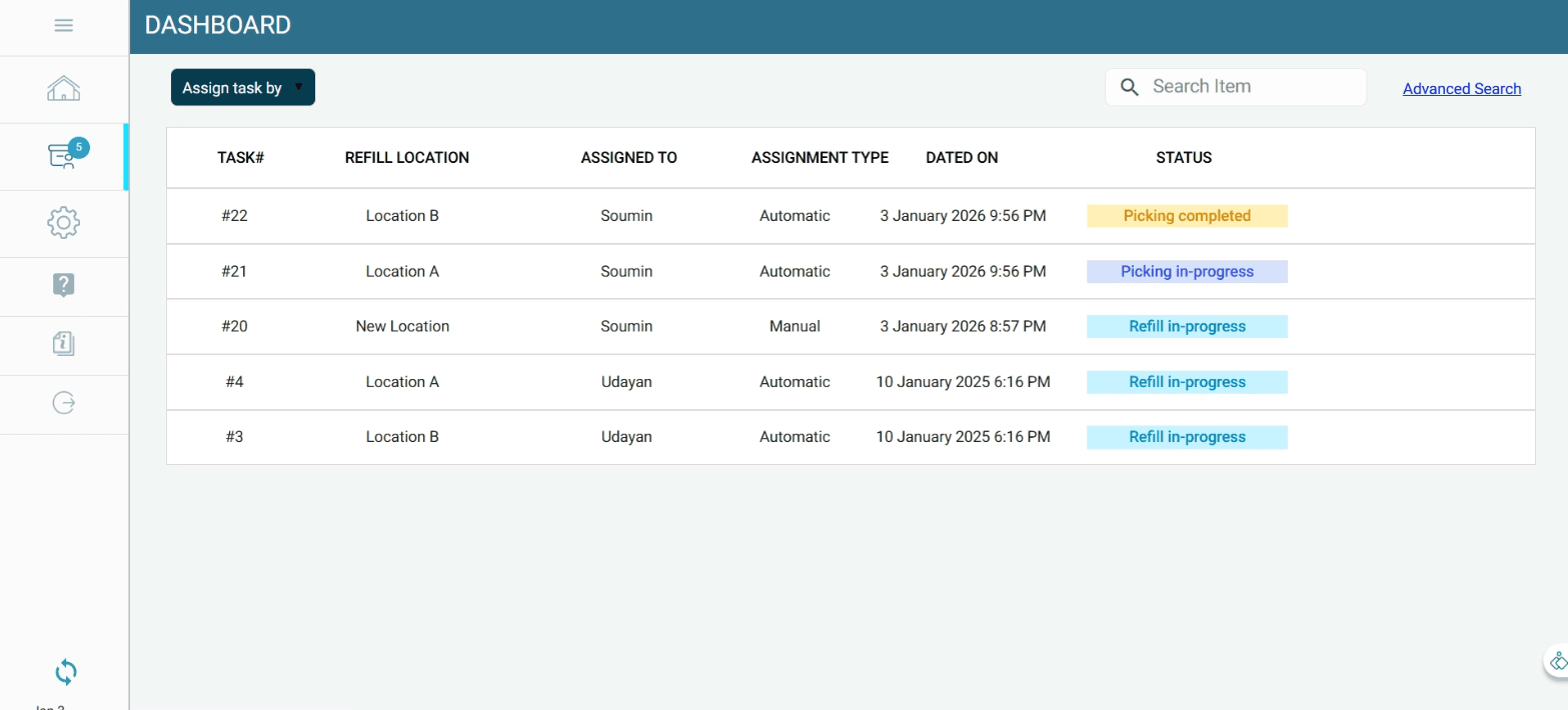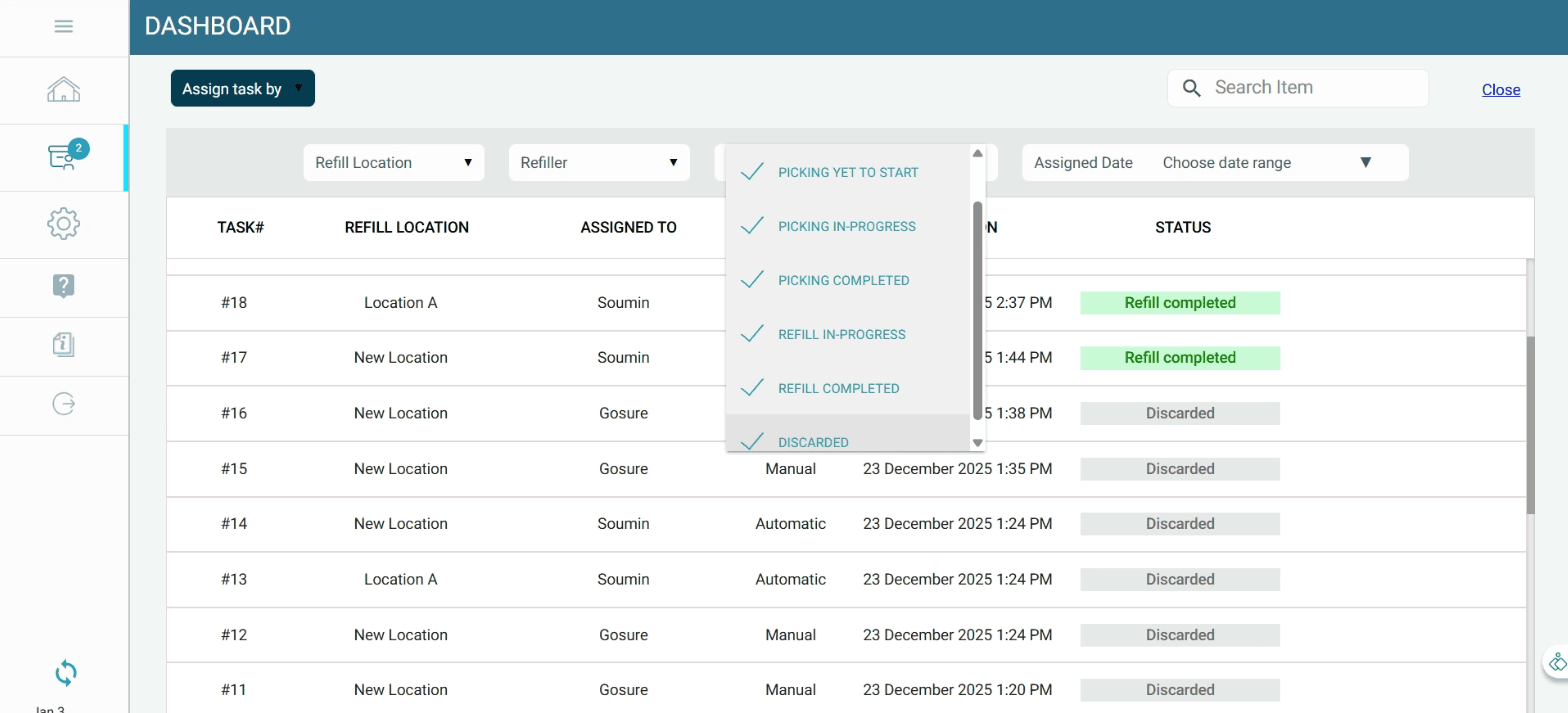 Manual stock refill tasks can be assigned to a refiller at any time, providing full operational control when required.