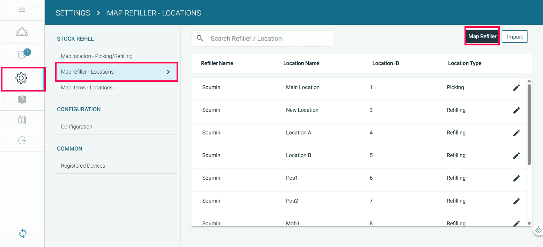 Refillers are mapped to specific picking and refilling locations.
