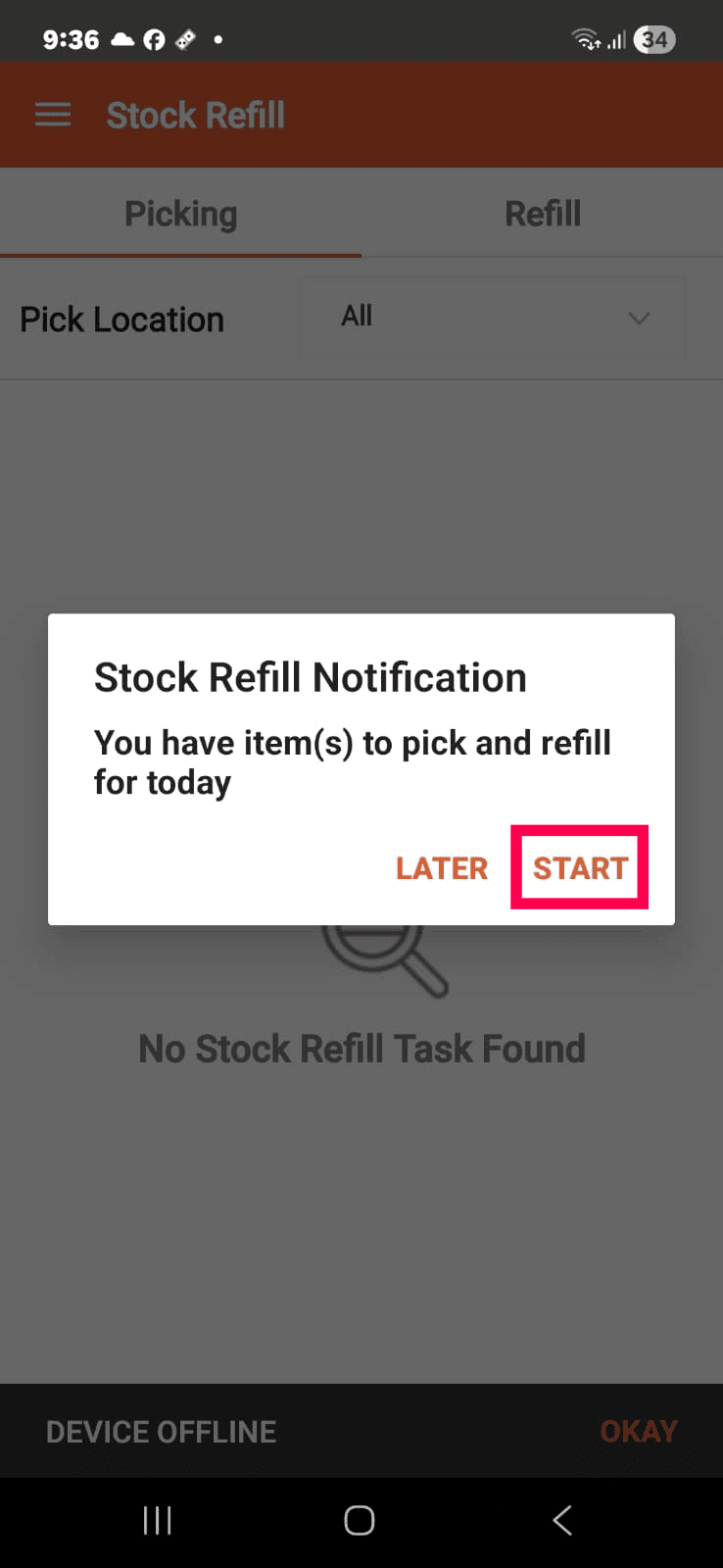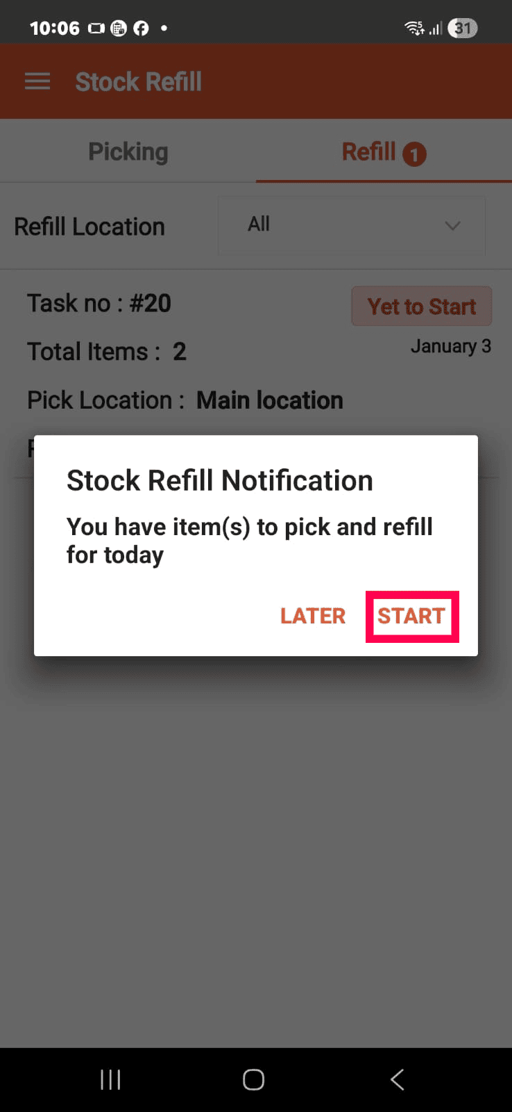 You will get this Stock Refill Notification in the mobile. Click the START option.