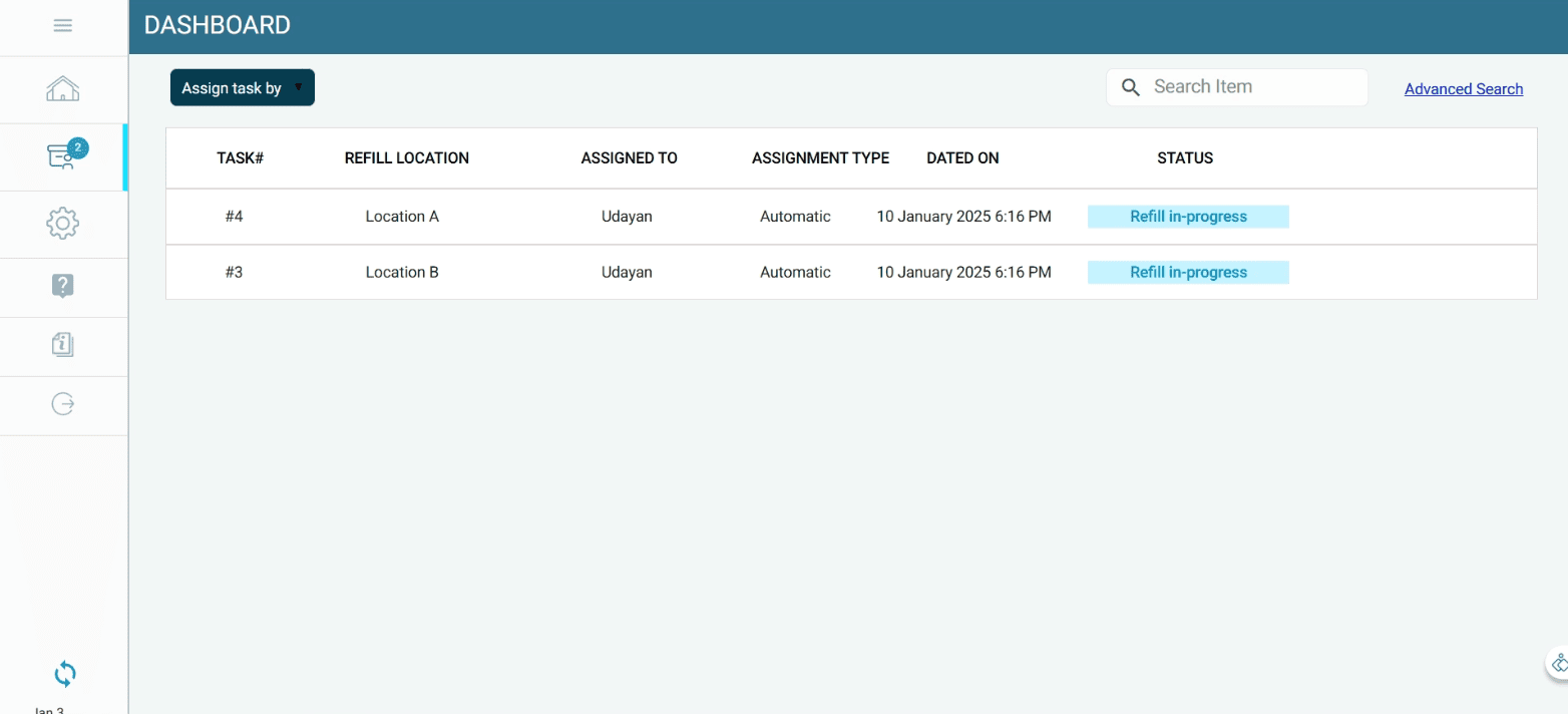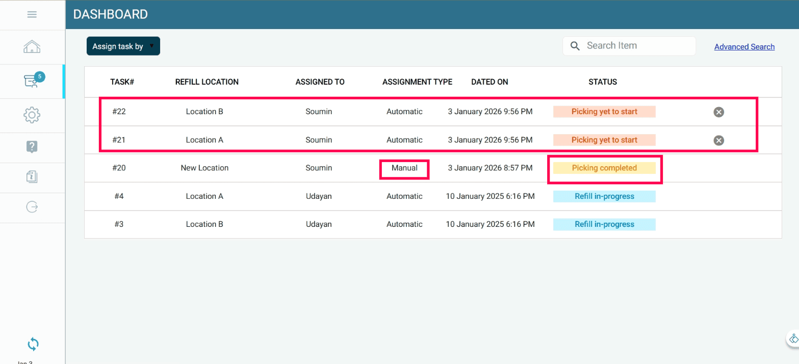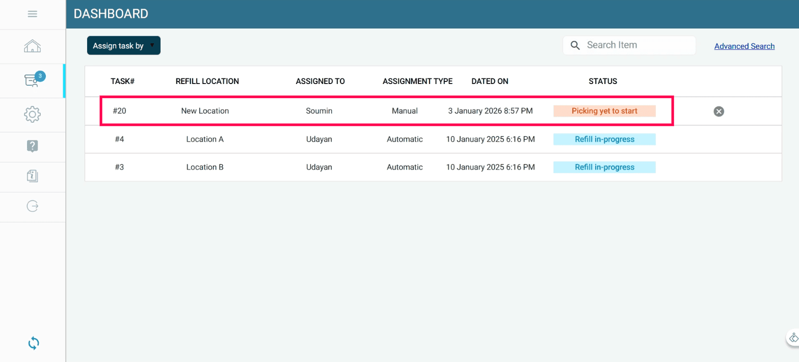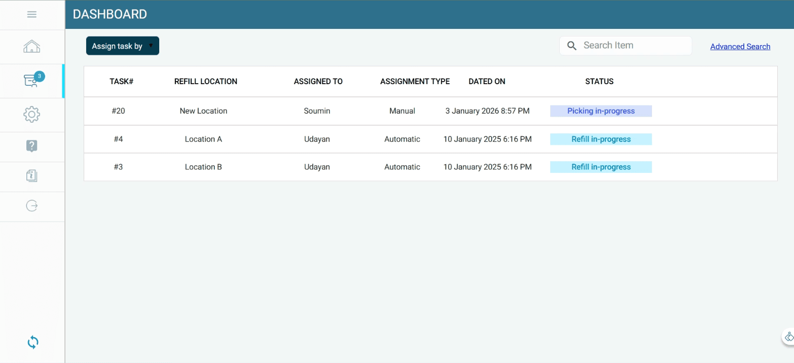 When the stock at a refill location falls below the minimum quantity, a refill task is automatically assigned to the mapped refiller.