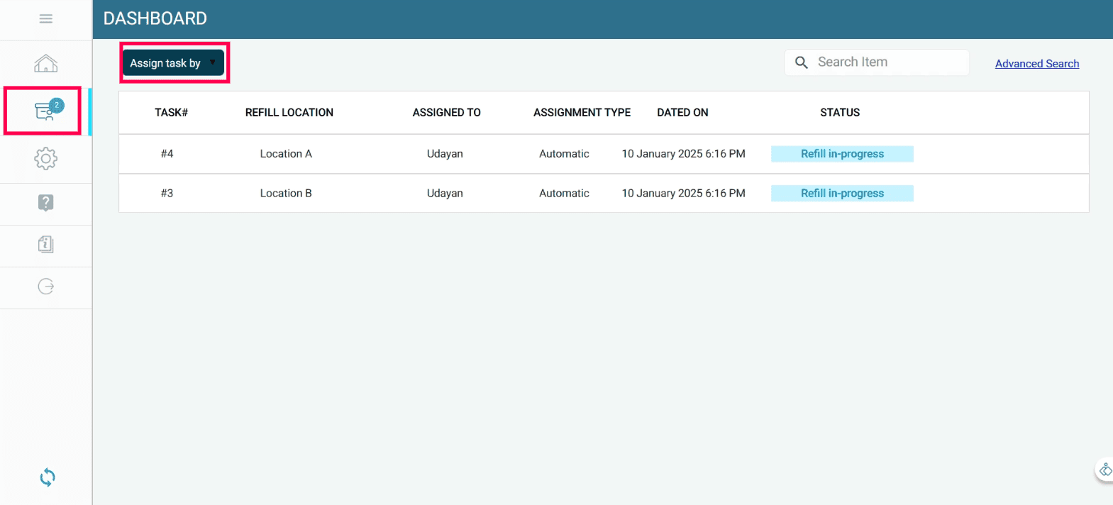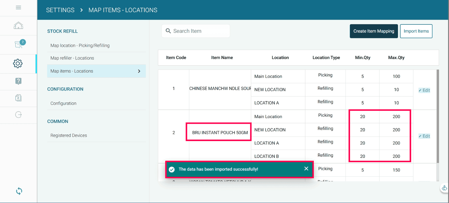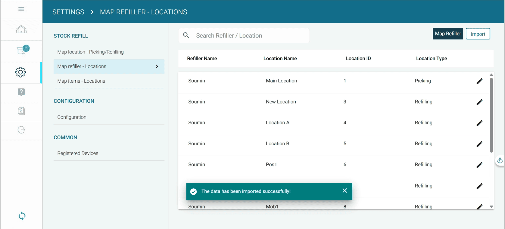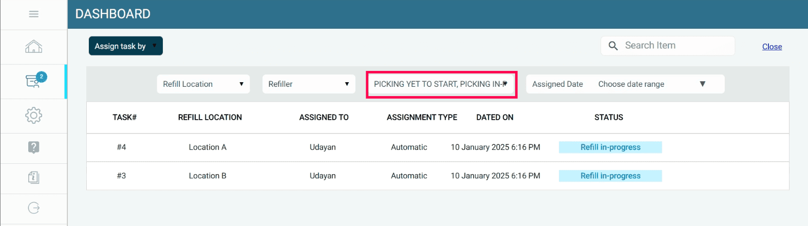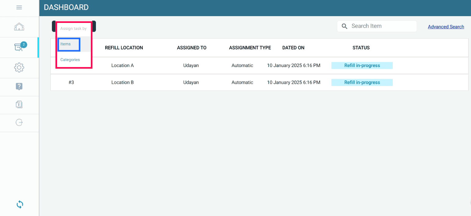 When the stock at a refill location falls below the minimum quantity, a refill task is automatically assigned to the mapped refiller.