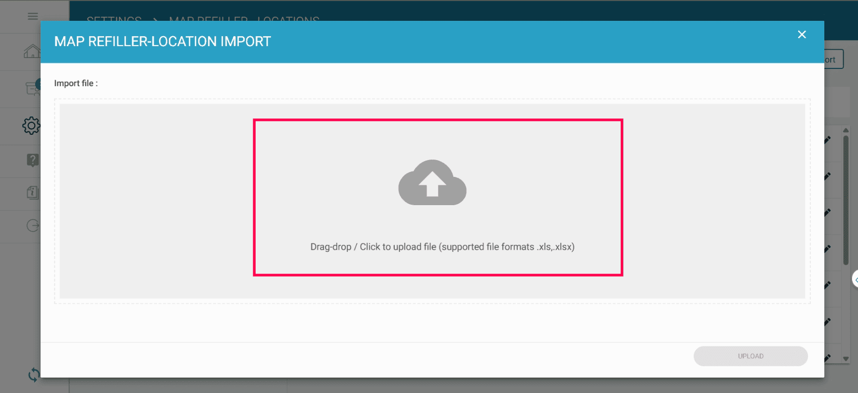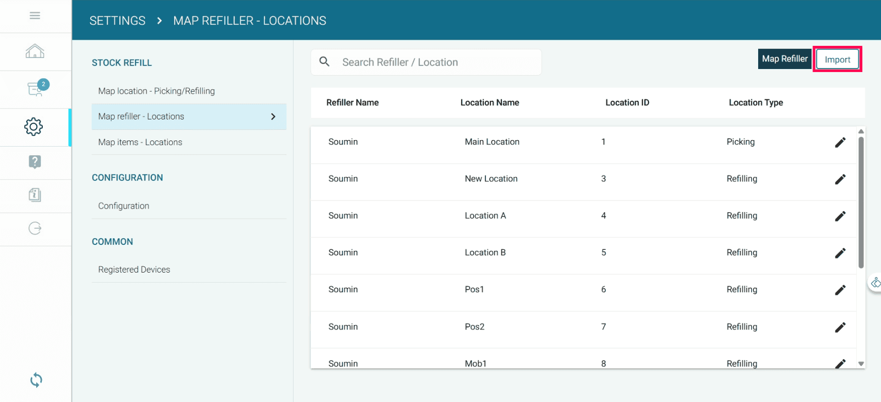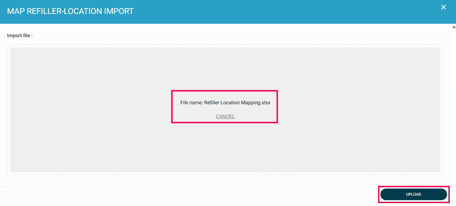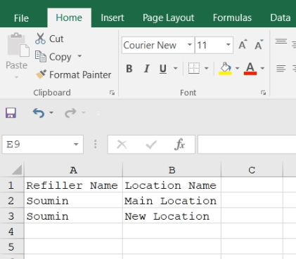 If you want to import the Refiller Name and the Location Name in bulk, create an Excel file with the heading Refiller Name and the Location Name.