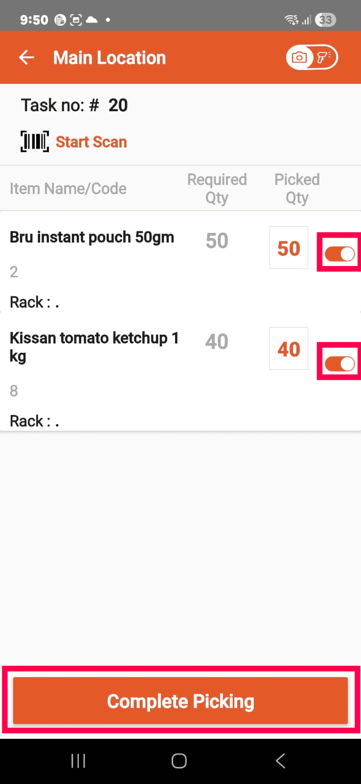 Tap the Picked Qty toggles or add the quantity manually.