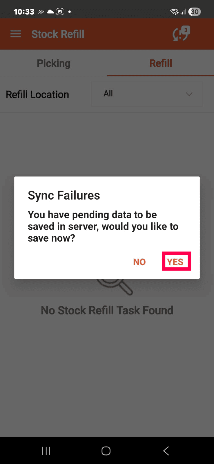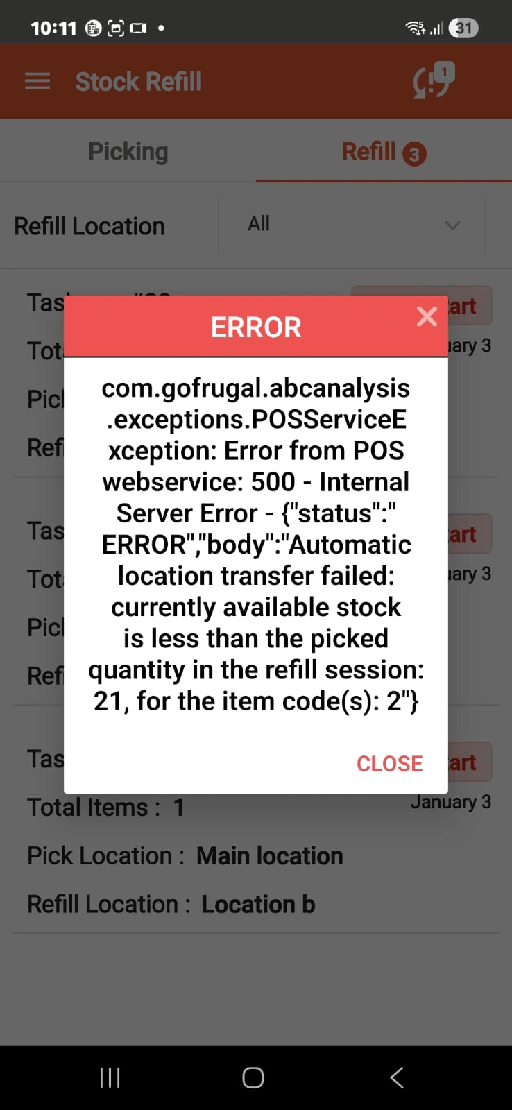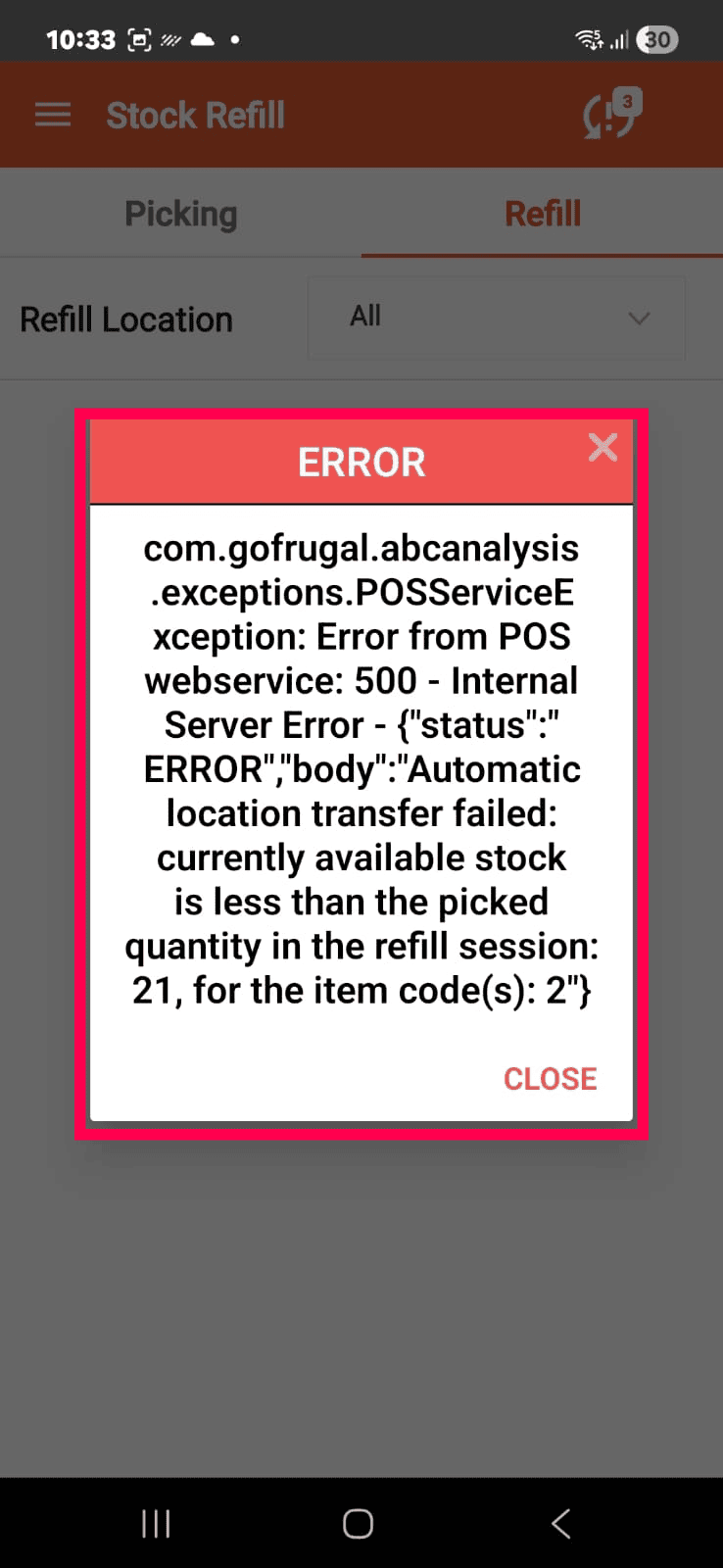When you tap on that you will get the below error message. Look carefully, the message states that the automatic location transfer failed as the available stock is less that the picked quantity in the refill session for the item code 2.