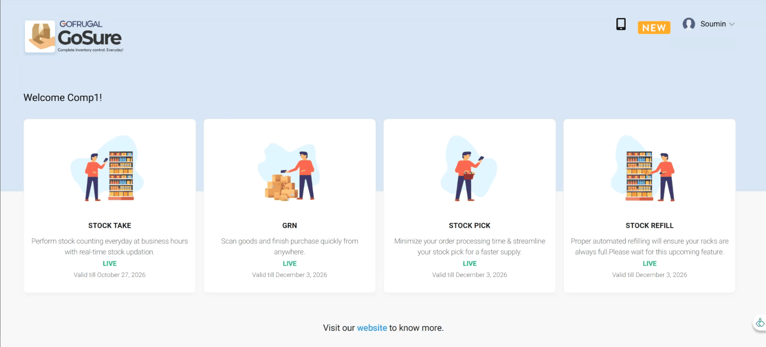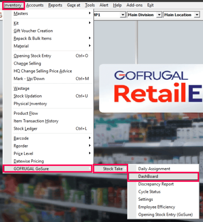Open the POS and navigate to Inventory > GOFRUGAL GoSure > Stock Take > DashBoard.