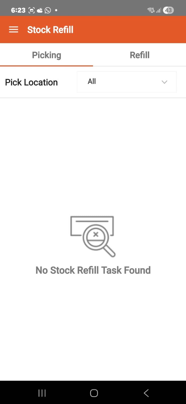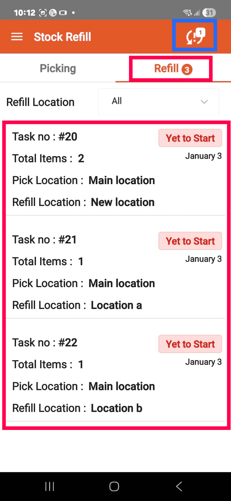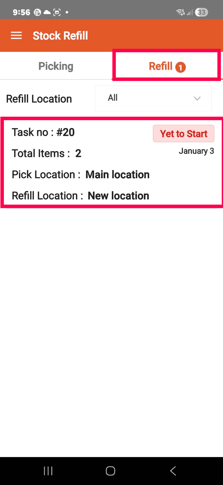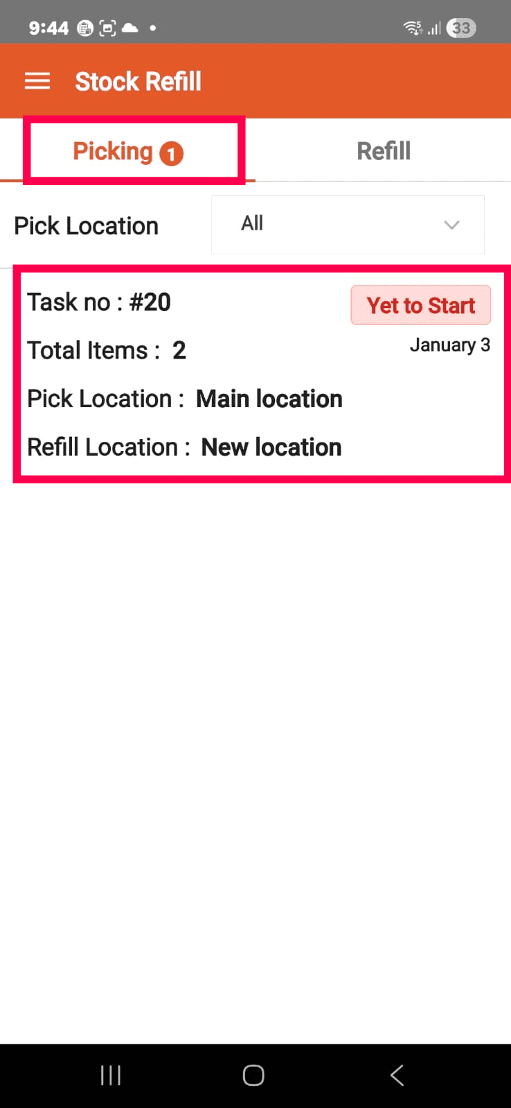 Note: You will see the Task No, Total Items, Pick Location, and Refill Location on the mobile app.