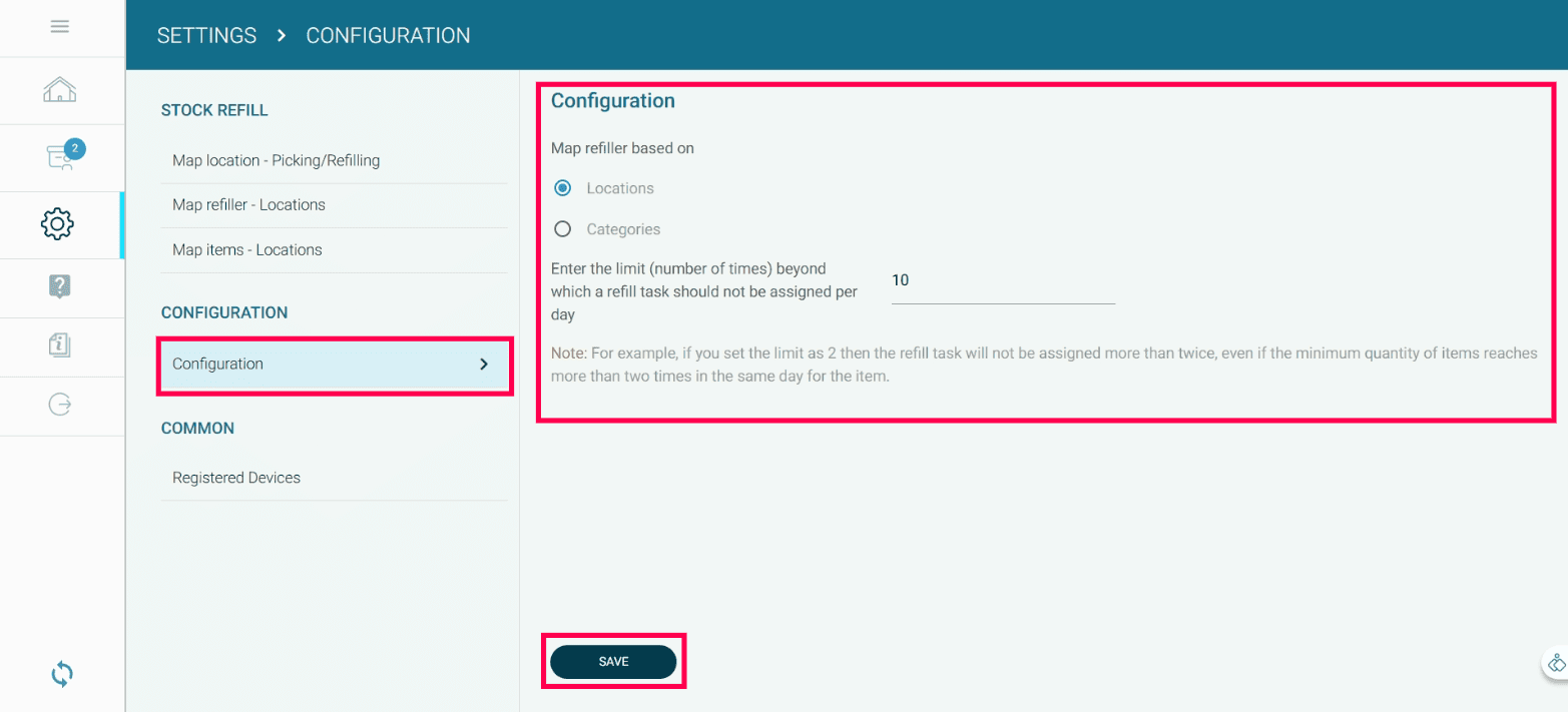 Note: For example, if you set the limit as 2, then the refill task will not be assigned more than twice, even if the minimum quantity of items reaches more than two times in the same day for the item.