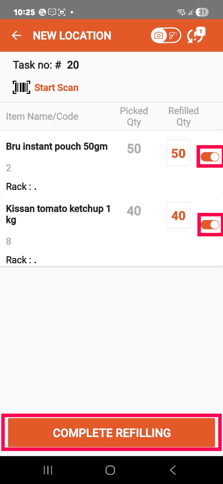 Tap the first refill task, then tap the Refilled Qty toggle or manually add the Refilled Qty.