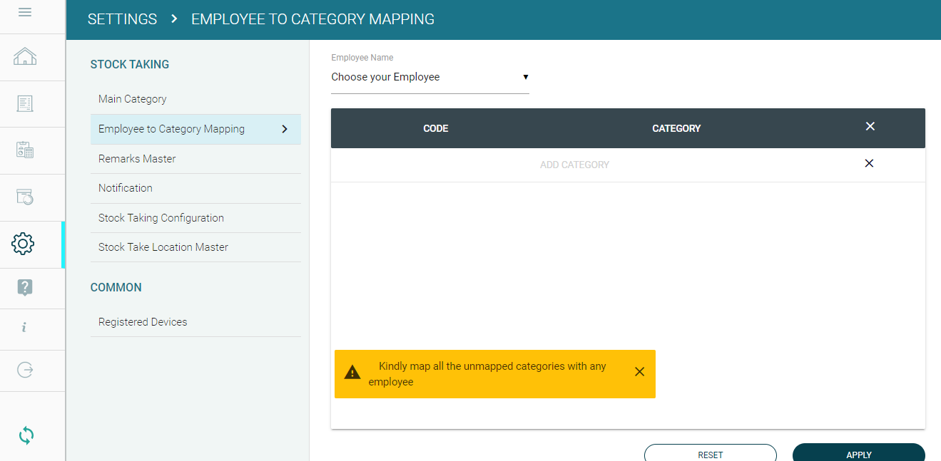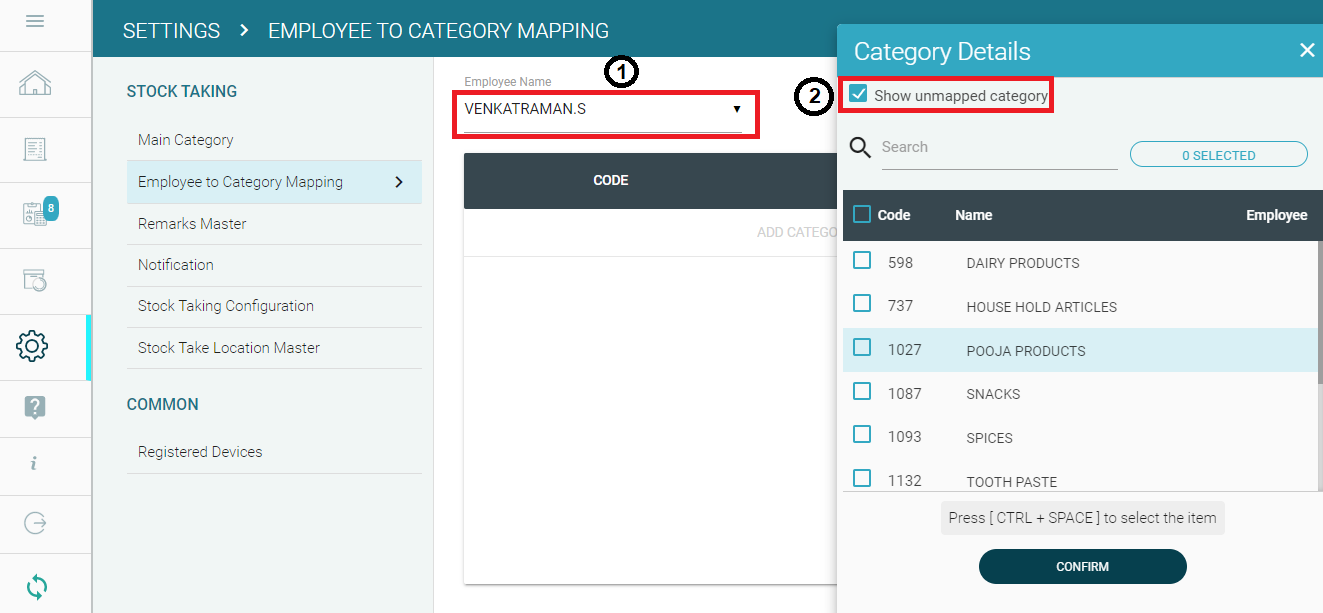 Step 3: To map the unmapped categories, click on the 'Employee to Category mapping' menu under the Setting tab, and select the employee name by selecting the name from the drop-down.