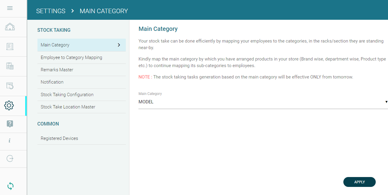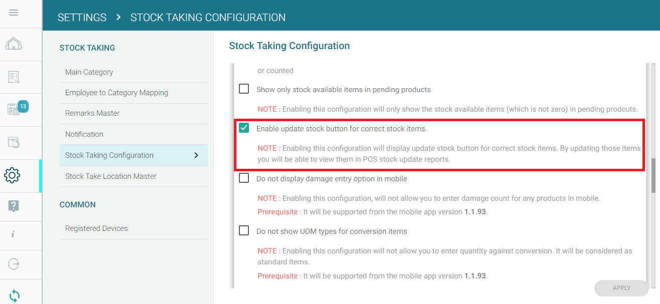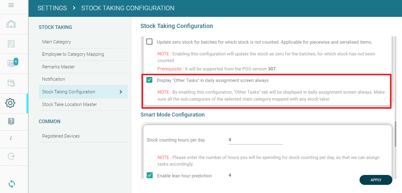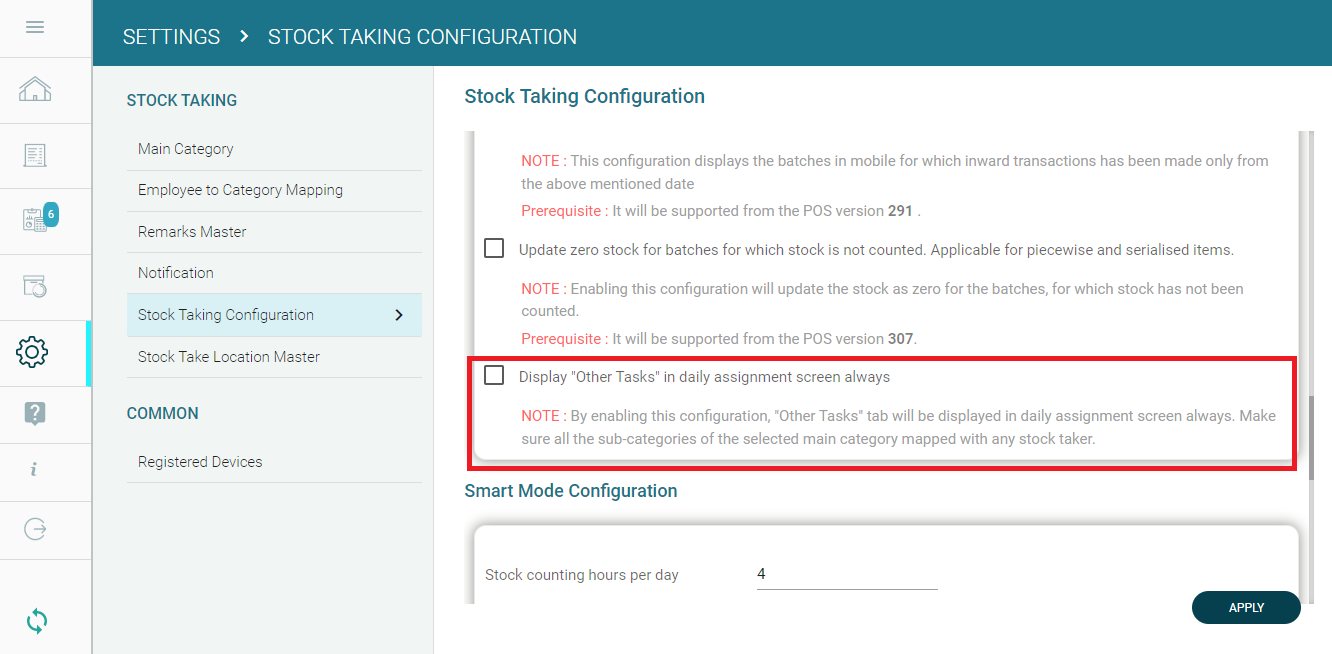Step 1: In GoSure StockTake web-app, go to Settings --> Stock Taking configuration. Enable the configuration 'Display "Other Tasks" in daily assignment screen always'.