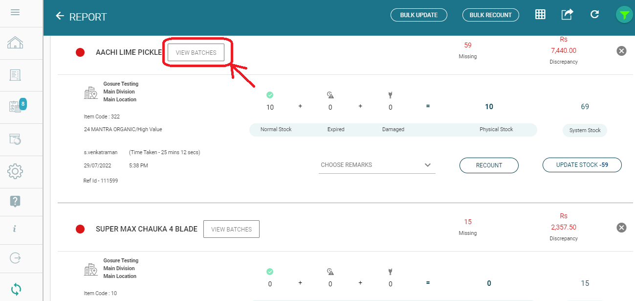 Step 8: You will be able to see the stock count of the different batches and in different locations by clicking on 'View Batches'.